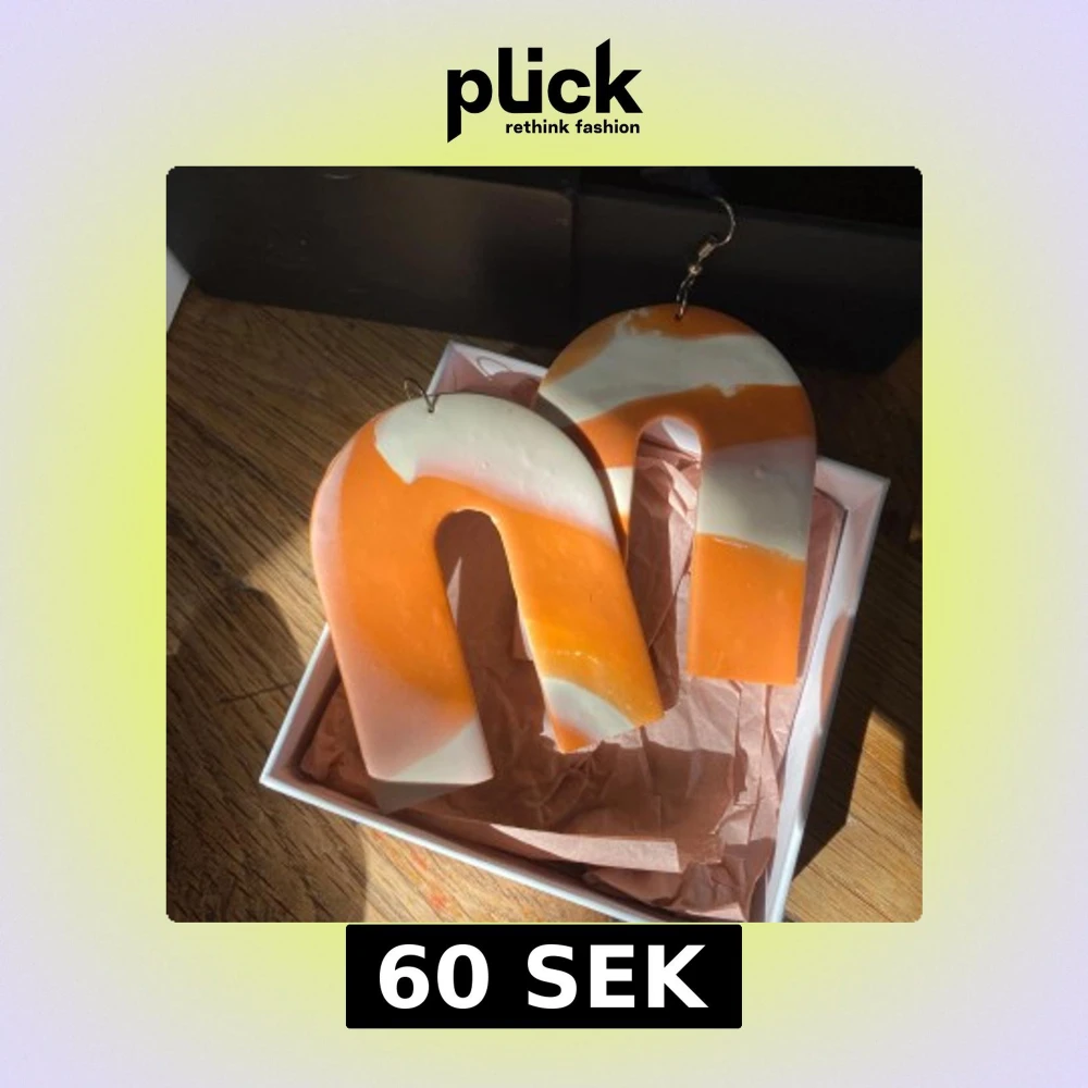 Unika, handgjorda örhängen i stor bågform med coolt randigt mönster i orange och vitt. Statement-accessoar som verkligen sticker ut och ger en färgklick till din look. Lätta att bära och perfekta för dig som gillar att synas.