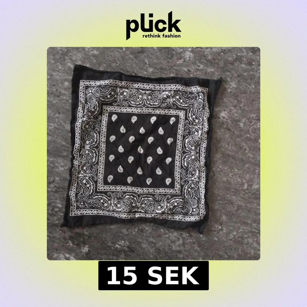 Snygg svart halsduk i bandana-stil med klassiskt vitt paisleymönster. Fyrkantig form, tunn och lätt att styla runt halsen eller i håret. Perfekt accessoar för att ge din outfit en cool touch.