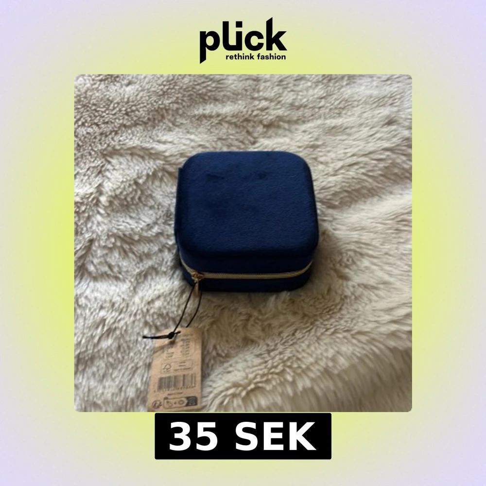 Snygg och praktisk mörkblå smyckesask med mjuk yta och guldfärgad dragkedja. Insidan har flera fack för ringar, örhängen och halsband samt en liten spegel i locket. Perfekt för att hålla dina favoritsmycken organiserade.