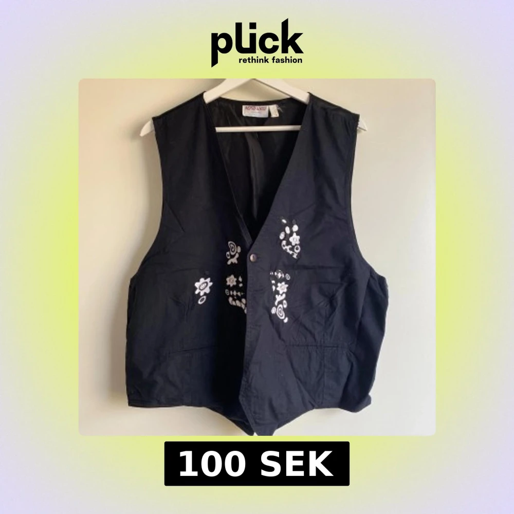 Svart väst från Berto Lucci med vit broderad design framtill. Västen har v-ringad hals, knappstängning och två fickor. Materialet känns som bomull och polyester, och broderierna ger en unik och cool vibe. Storleken är okänd men känns som M!
