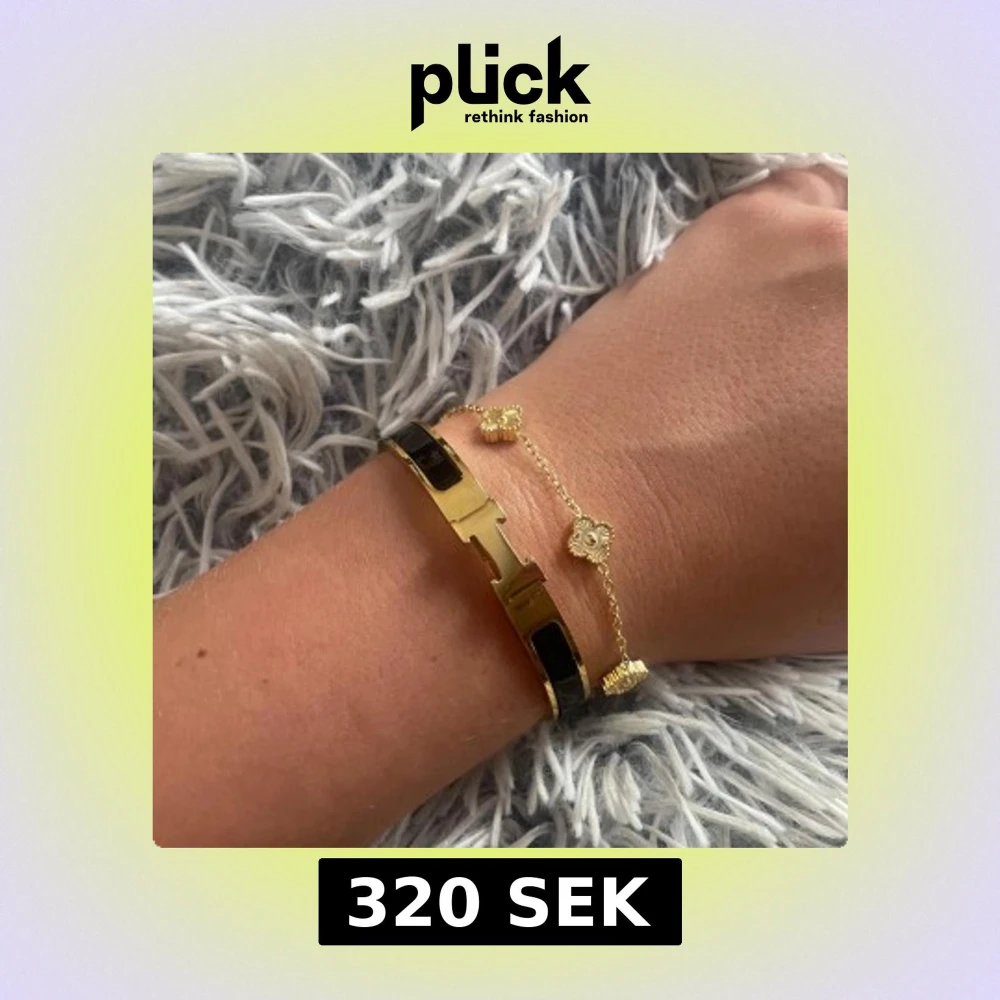 Två snygga armband säljes! Ett stilrent guldarmband med svarta inslag och H-formad design, samt ett tunt guldarmband med små blommor som ger en söt touch. Perfekt för dig som gillar att mixa klassiskt med trendigt.