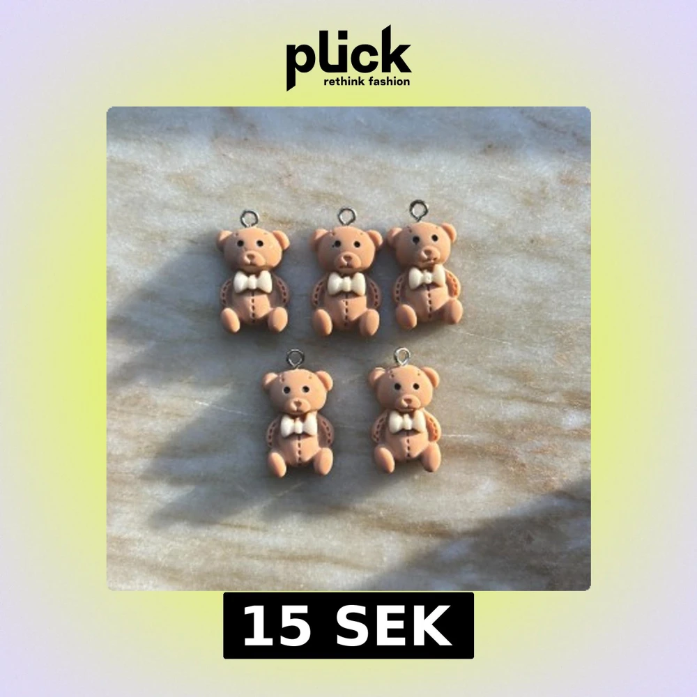 Fem stycken gulliga berlocker formade som nallebjörnar i beige med vita rosetter. Perfekta att använda till halsband eller armband för en personlig och lekfull stil. Små detaljer som knappar och öron gör dem extra charmiga.