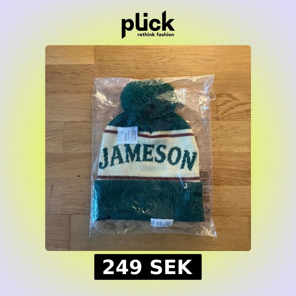 Säljer en grön och vit mössa från Jameson med stor tofs på toppen och bred uppvikt kant. Mössan har texten 'JAMESON' i grönt och tunna röda ränder. Perfekt accessoar för kalla dagar. Helt ny