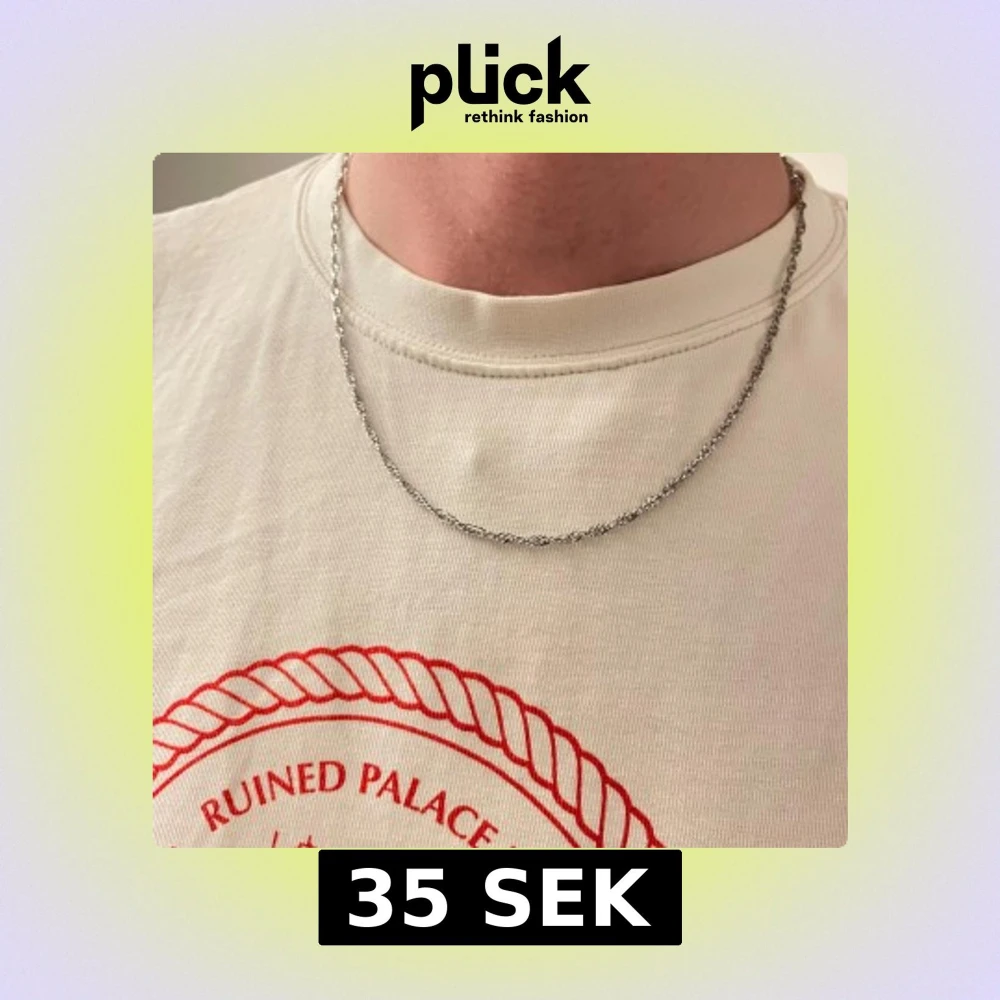 Säljer ett stilrent halsband med tunn, tvinnad kedja i silverfärg. Perfekt för dig som gillar minimalistiska smycken och vill ha något som funkar till alla outfits. Lätt att matcha med andra accessoarer. Osäker på märke. Helt nytt