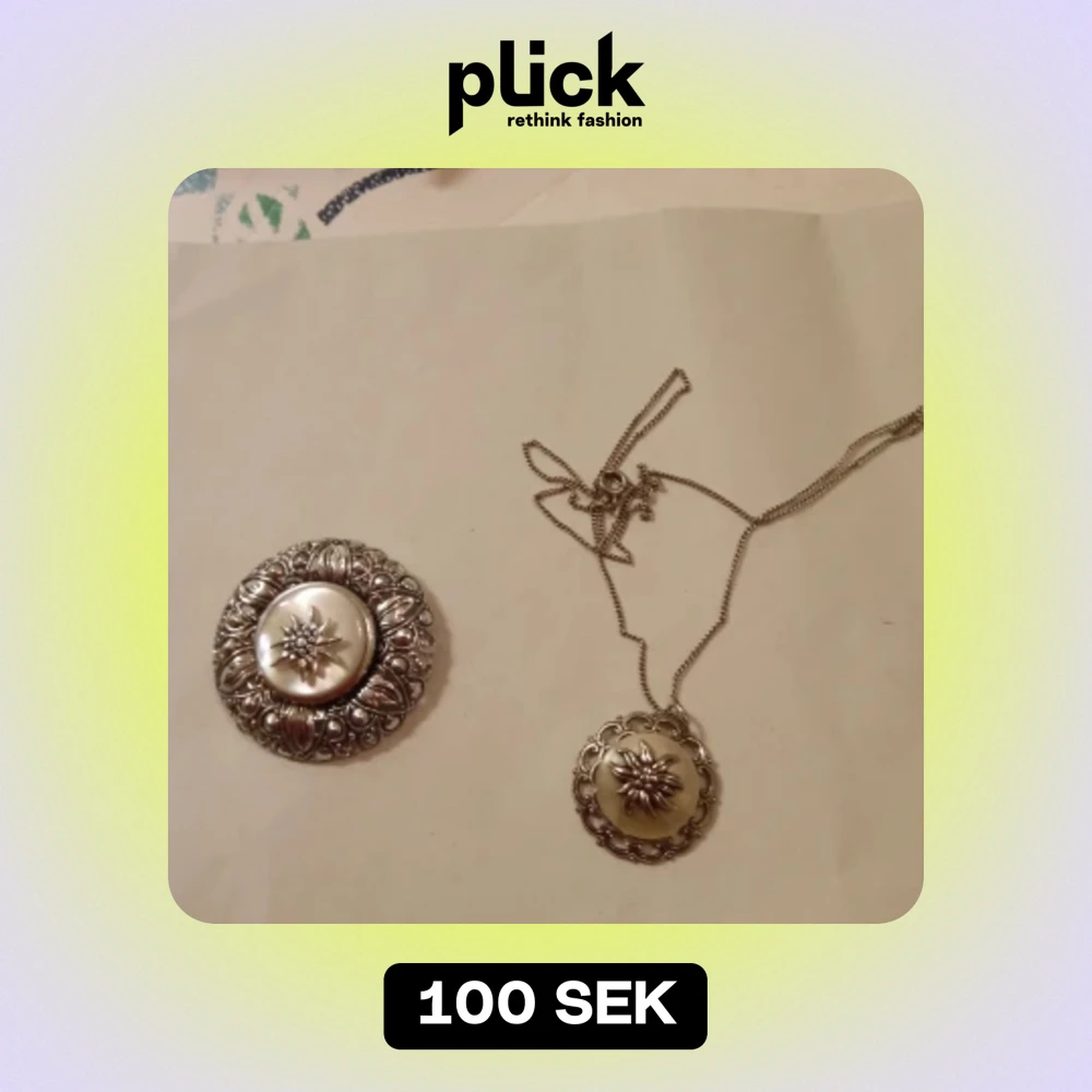 Kedja i Silver 835 o hänge och brosch mönstrad i metall .stämpel på låset på kedjan .Fint skick .
