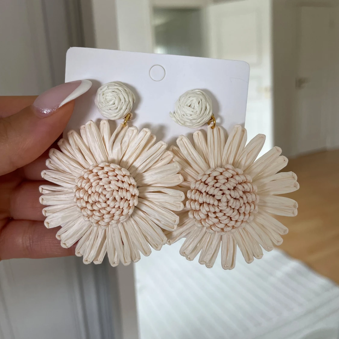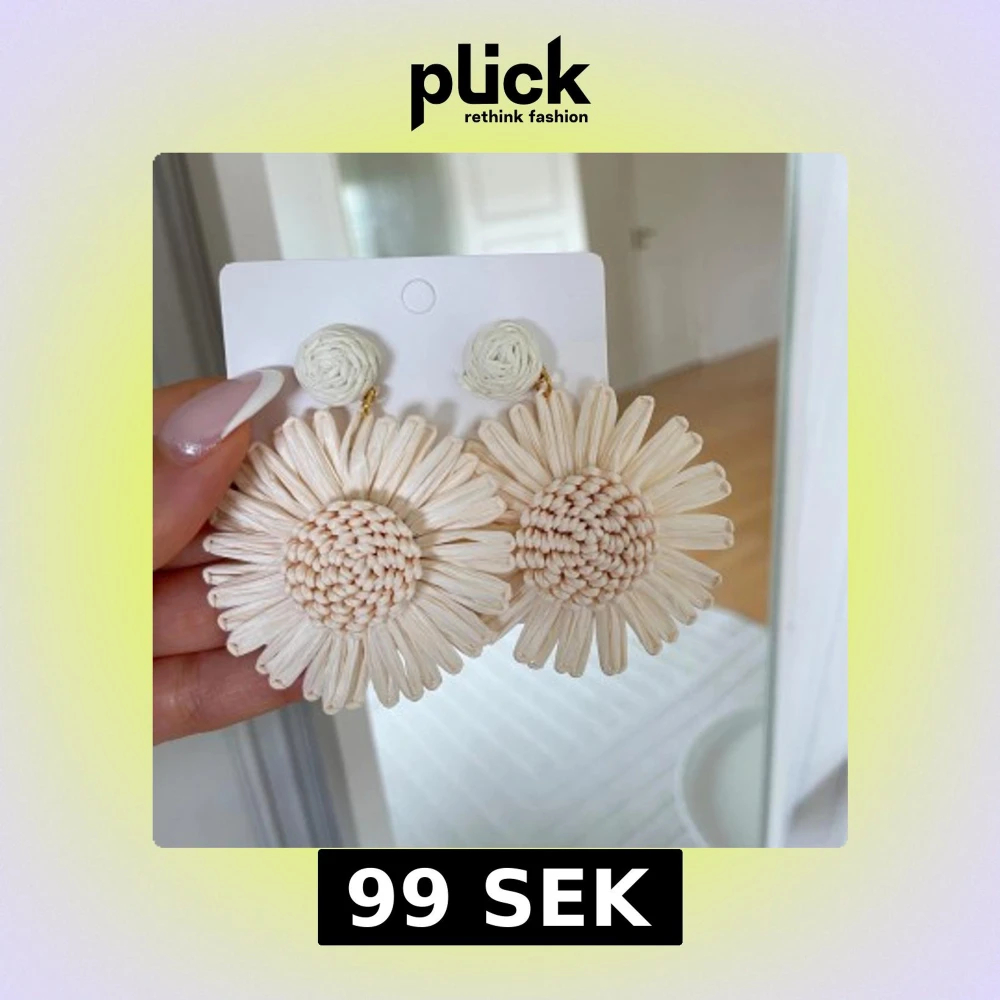 Säljer ett par stora, handgjorda örhängen i form av blommor. De är tillverkade i flätat naturmaterial och har en ljus beige färg. Perfekta för att ge en bohemisk touch till din stil.