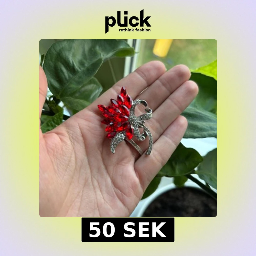 Superfin brosch i form av en blomma med gnistrande röda stenar och silverfärgade detaljer. Blomman har ett glittrigt utseende och fästs enkelt med nål på baksidan. Perfekt för att ge din outfit en extra touch av glamour.