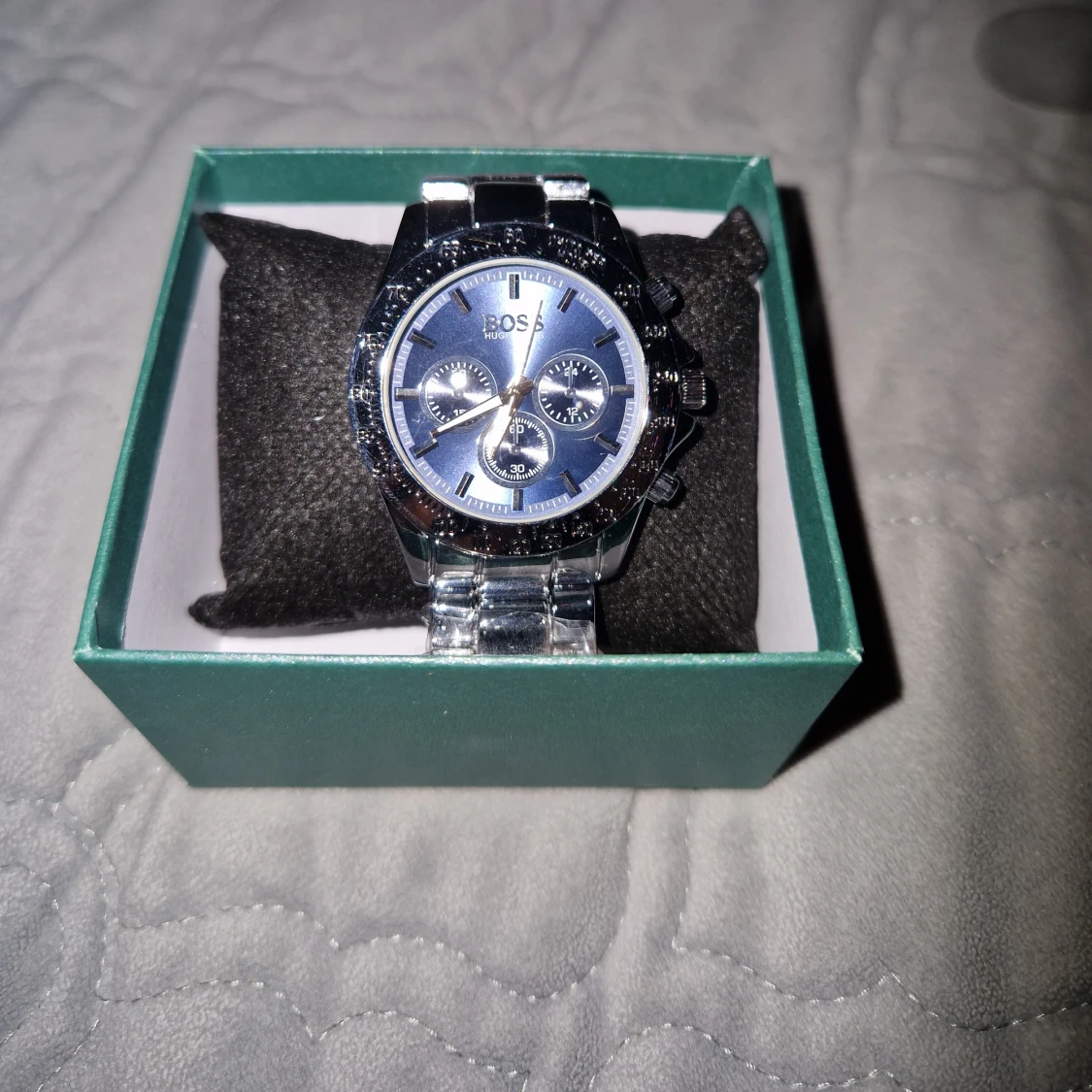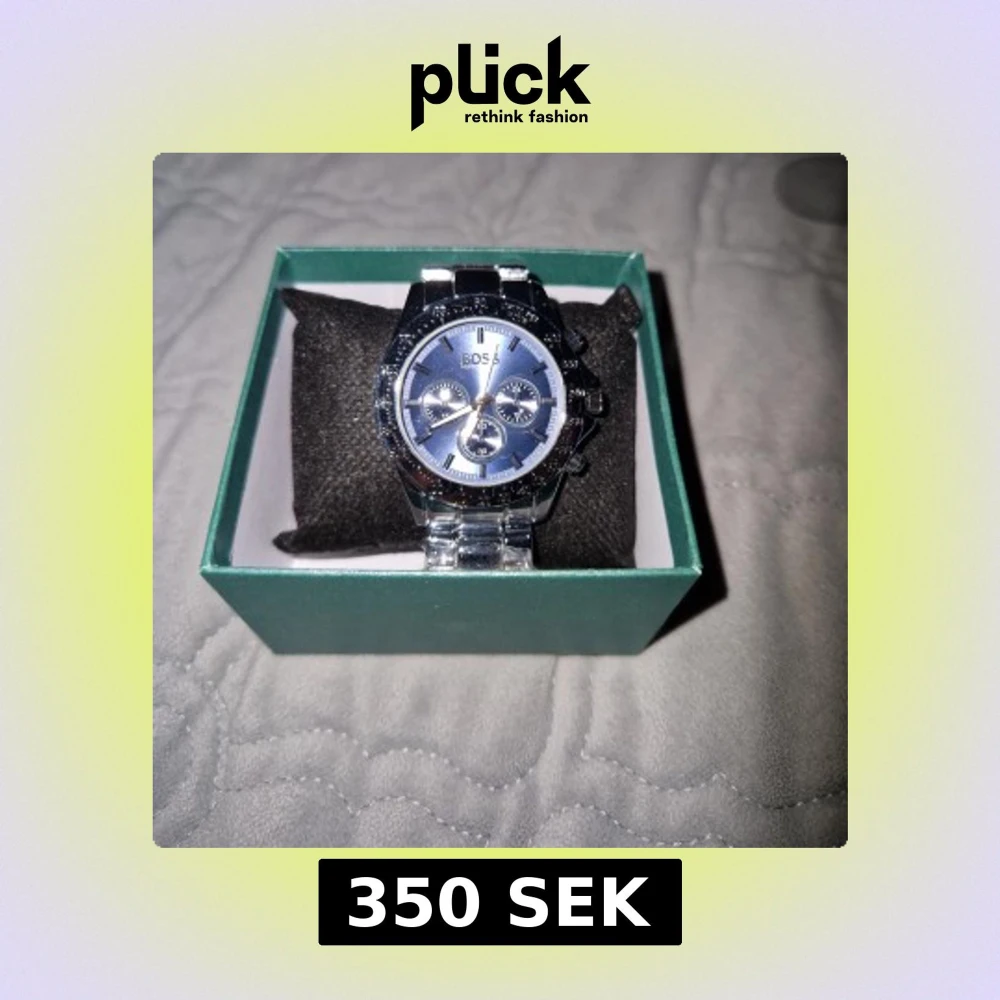 (Utan boxen) Stilren klocka med rund urtavla och länkarmband i blankt silverfärgat stål. Urtavlan har tydliga markeringar och flera knappar på sidan för extra funktioner. Perfekt för dig som gillar en clean och tidlös look.