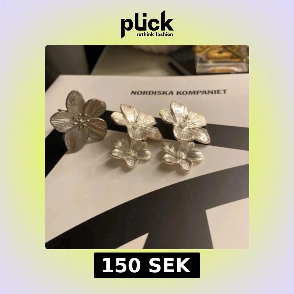 Säljer ett set med silvriga smycken i form av stora blommor. Setet består av ett par örhängen med dubbla blommor och en matchande ring med en stor blomma. Alla delar har fina detaljerade blomblad som ger en lyxig och unik känsla.
