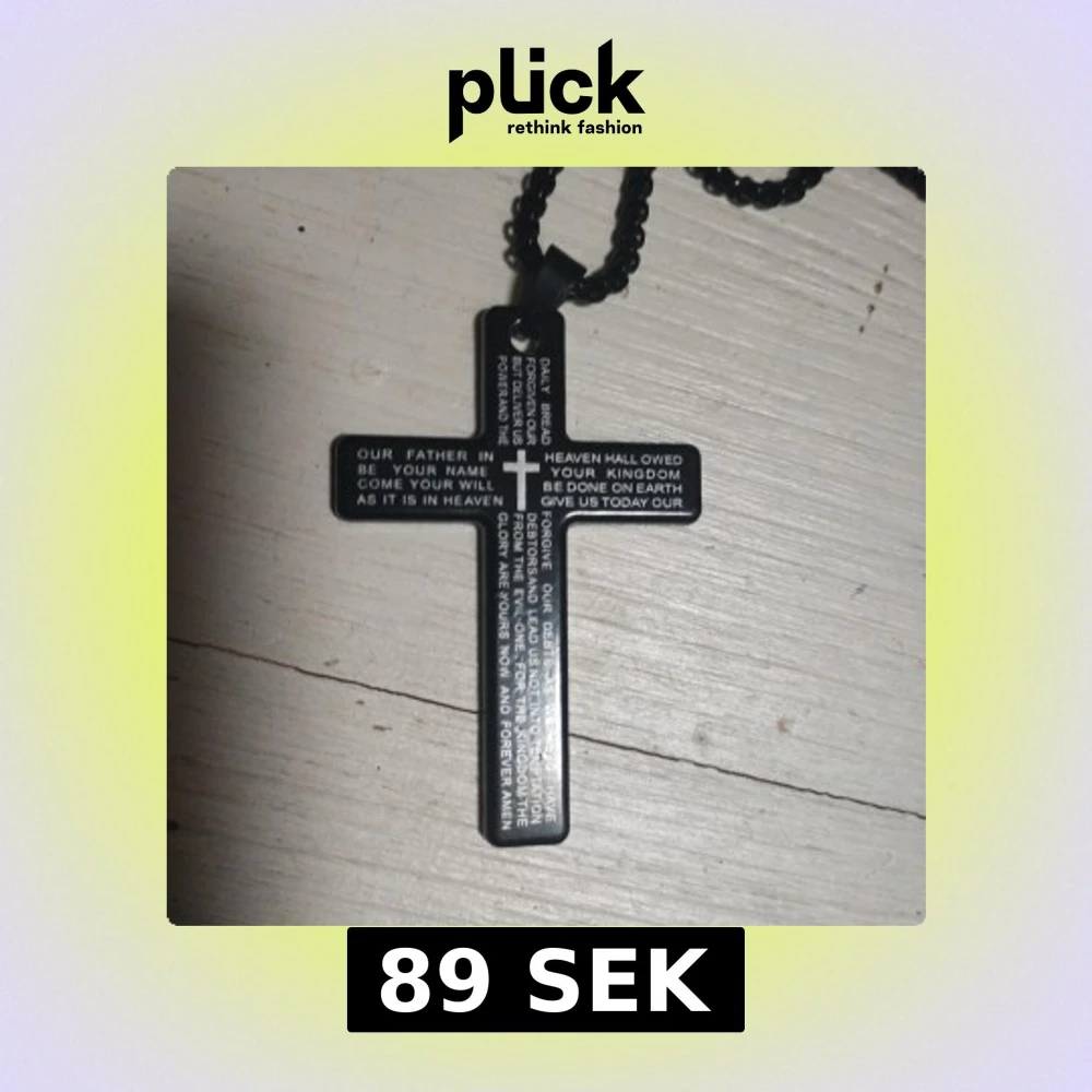 Stilrent svart halsband med korsformat hänge. Hänget har ingraverad text med Fader Vår-bönen på engelska och ett litet kors i mitten. Kedjan är grov och matchar hängets svarta färg. Perfekt för dig som gillar statement-smycken med religiös touch.