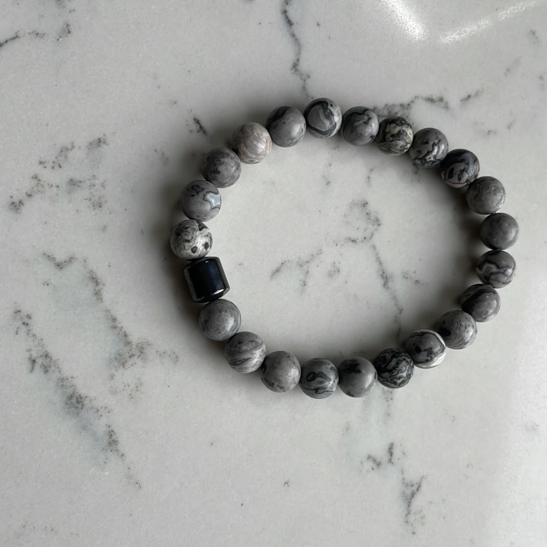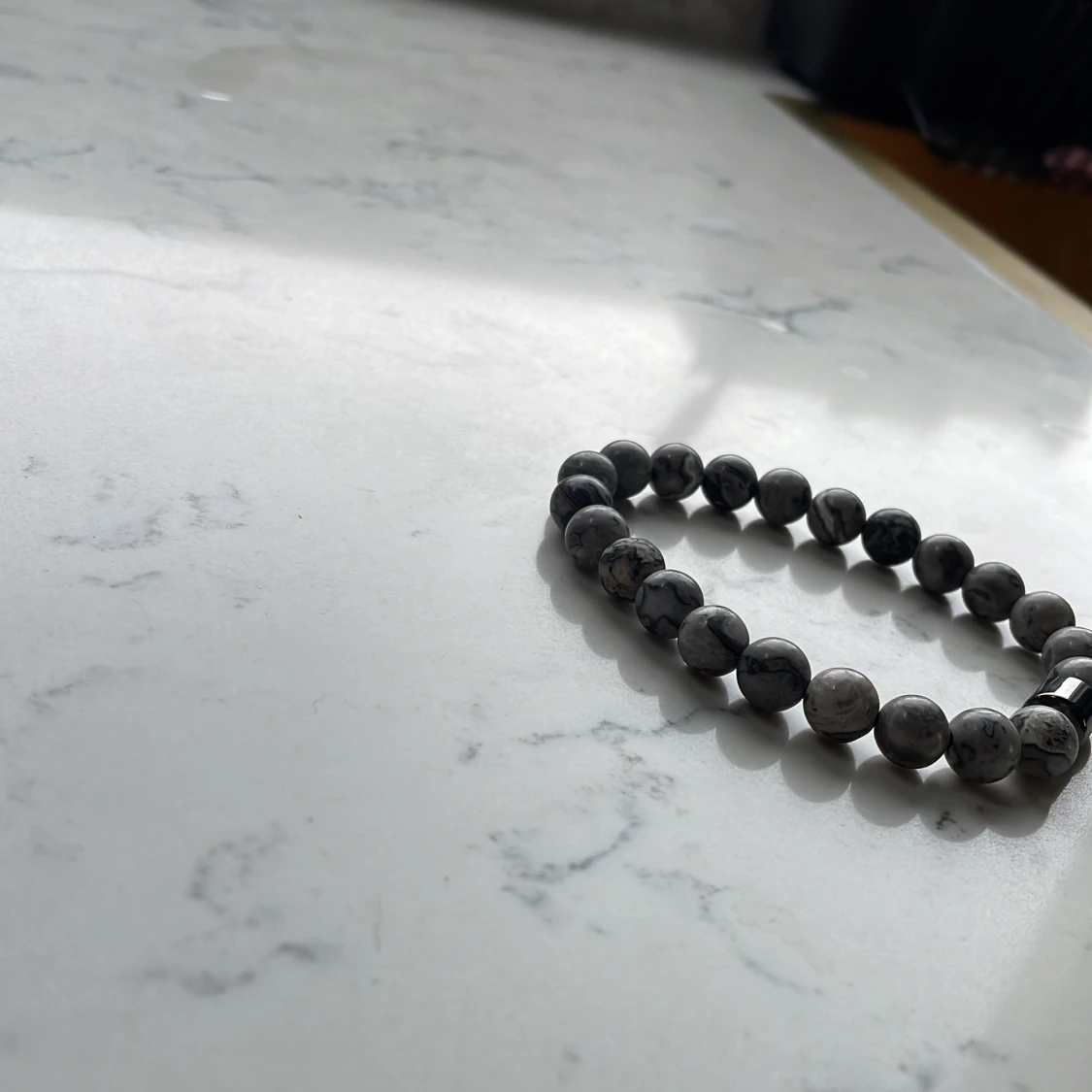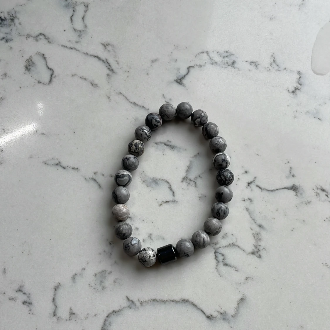Snyggt armband med runda pärlor i gråmelerad stenlook och en svart cylinderformad detalj. Elastiskt band gör det enkelt att ta på och av. Perfekt accessoar för att lyfta din outfit med en cool och stilren vibe.