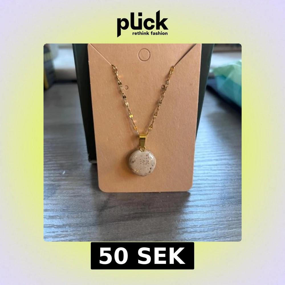 Snyggt halsband med kedja i guldton och en rund beige berlock med små guldiga stänk. Kedjan har en glansig finish som ger extra bling. Perfekt accessoar för att lyfta din outfit med en unik detalj.