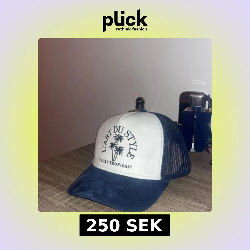 Säljer en snygg truckerkeps från L'Art Du Style med vit front och blått nät bak. Kepsen har broderad text och palmmotiv framtill samt böjd skärm i blått tyg. Justerbar snapback baktill för perfekt passform.