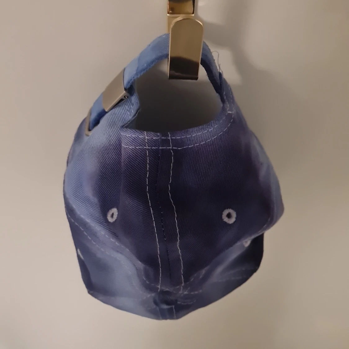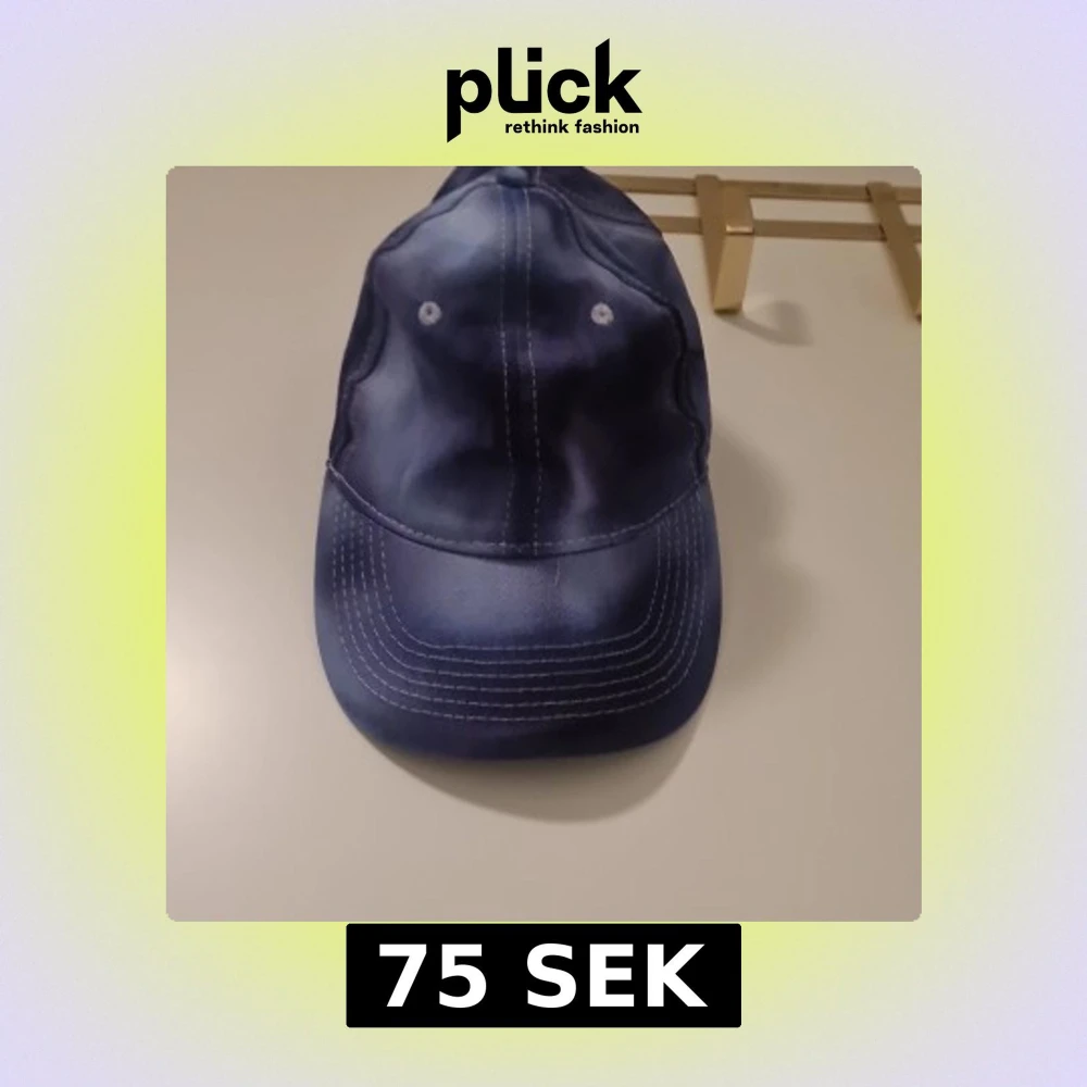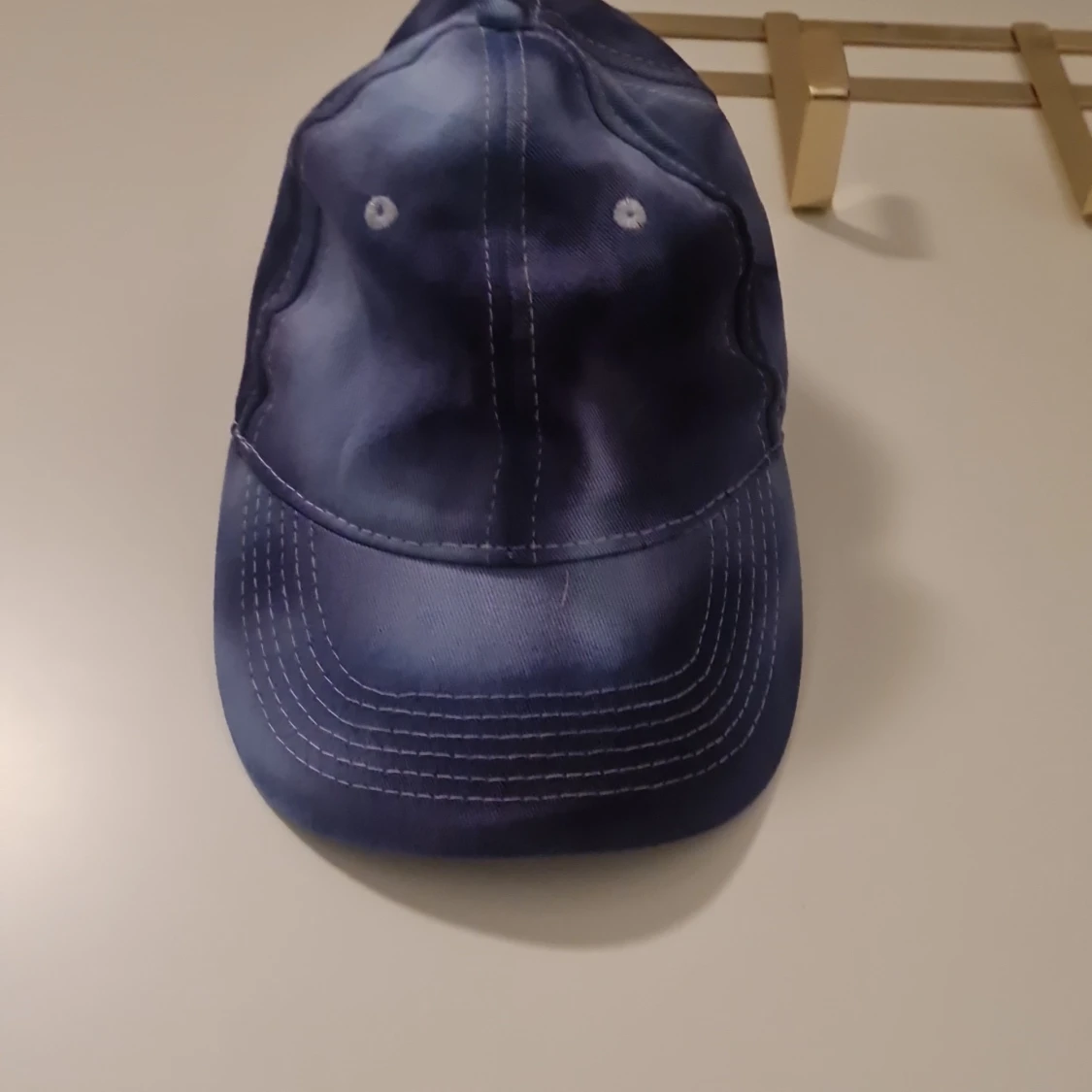 Snygg blå keps med vit söm och justerbart spänne baktill. Perfekt för en avslappnad stil.