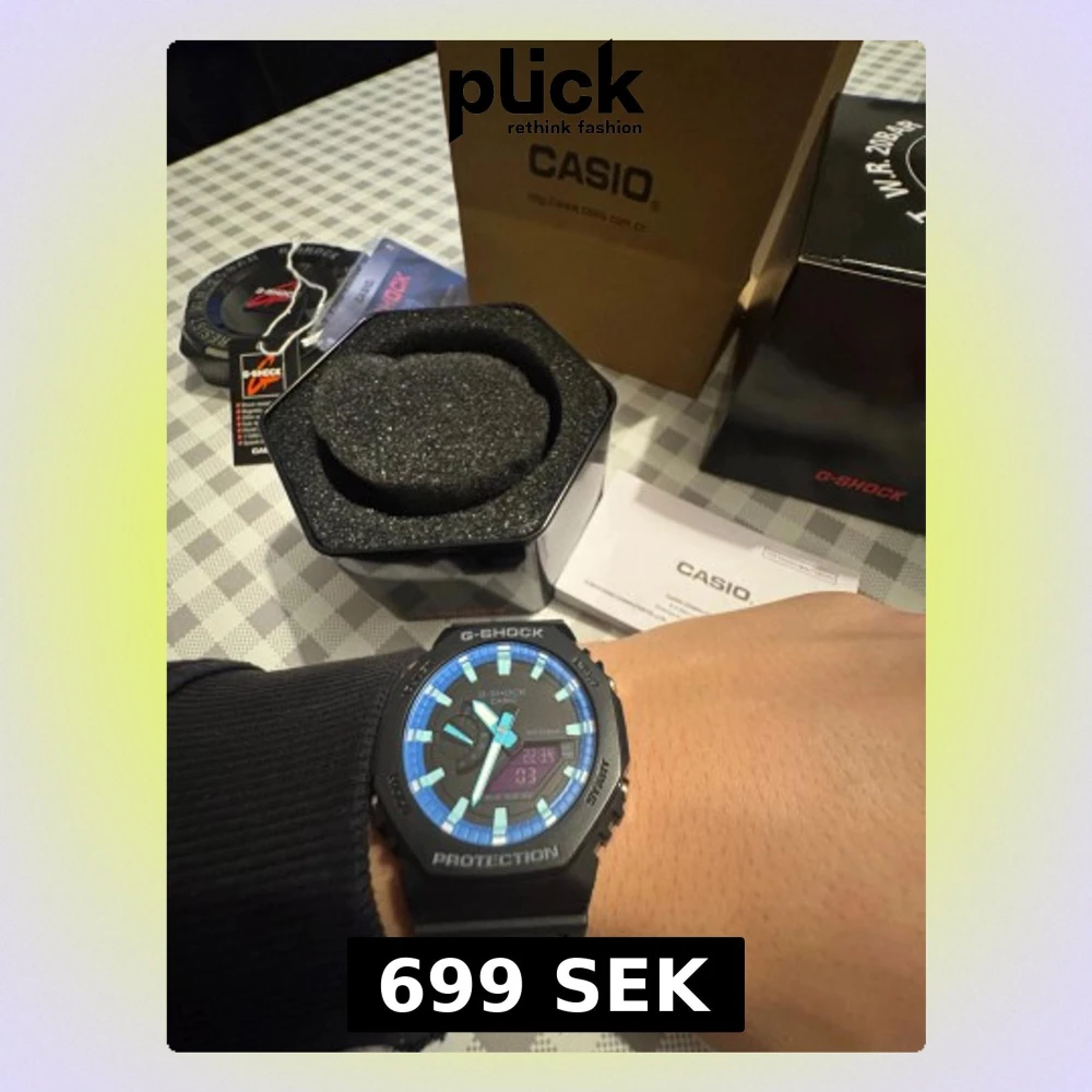 Casio G-Shock GA-2100 är en robust digital/analog klocka i svart med blå detaljer. Klockan har oktagonal boett, resinarmband och Carbon Core Guard-teknologi. Vattentät till 200m, stöttålig och med digital display. Levereras med originalbox, manual och taggar.