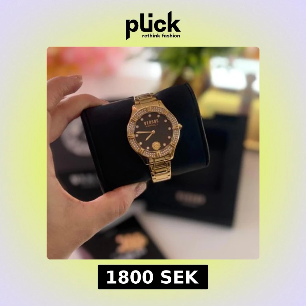 Snygg klocka från Versus Versace i guldigt metallarmband och svart urtavla med diskret randigt mönster. Urtavlan är dekorerad med gnistrande stenar runt ramen och lejonlogga vid sexan. Perfekt accessoar för att sticka ut och ge looken extra lyx.