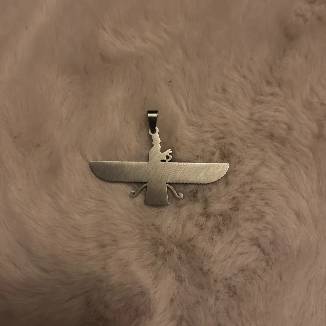 Unikt halsband med en detaljrik Faravahar-symbol i silverfärg. Hängsmycket har snygga linjer och en cool, stilren look. Perfekt för dig som gillar persisk kultur och vill ha något speciellt runt halsen.