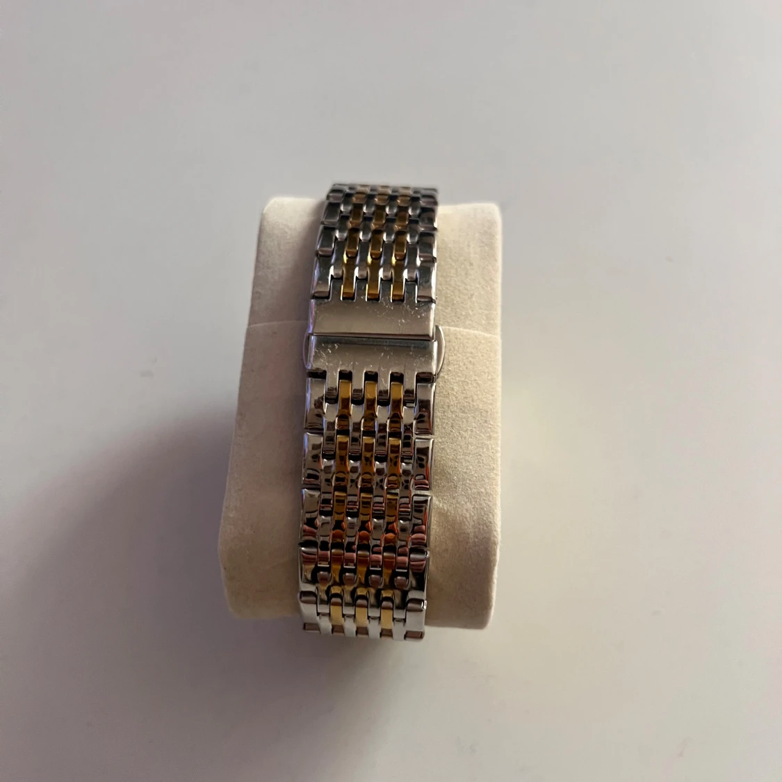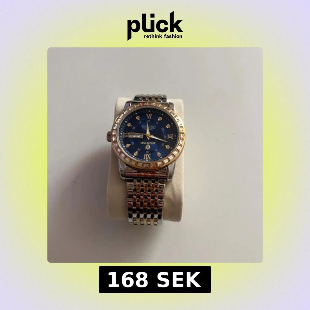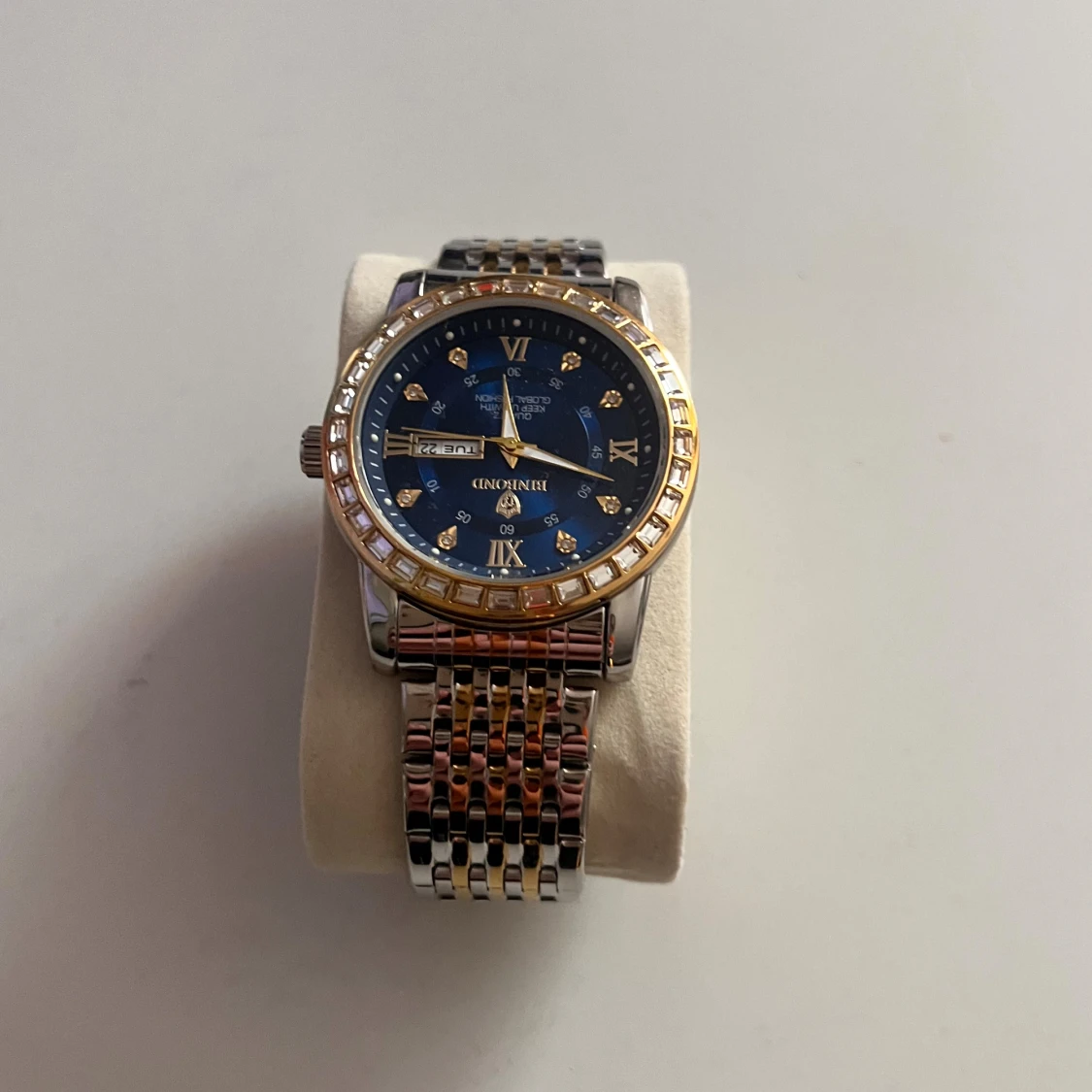 Stilren klocka med blå urtavla, guldfärgade romerska siffror och stenar som index. Boetten är silverfärgad med guldfärgad ring runt urtavlan. Länkarmbandet är i tvåtonad silver och guld, vilket ger en lyxig känsla. Klockan har dag- och datumvisning.
