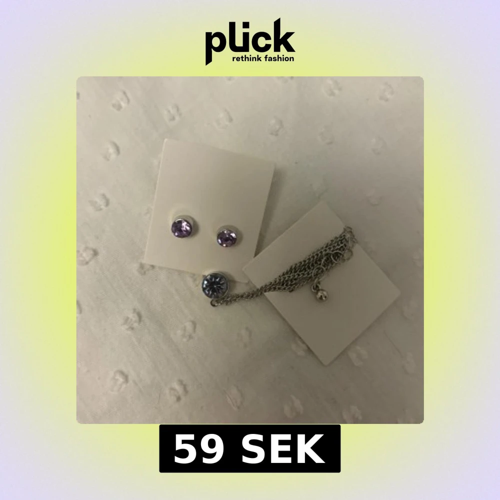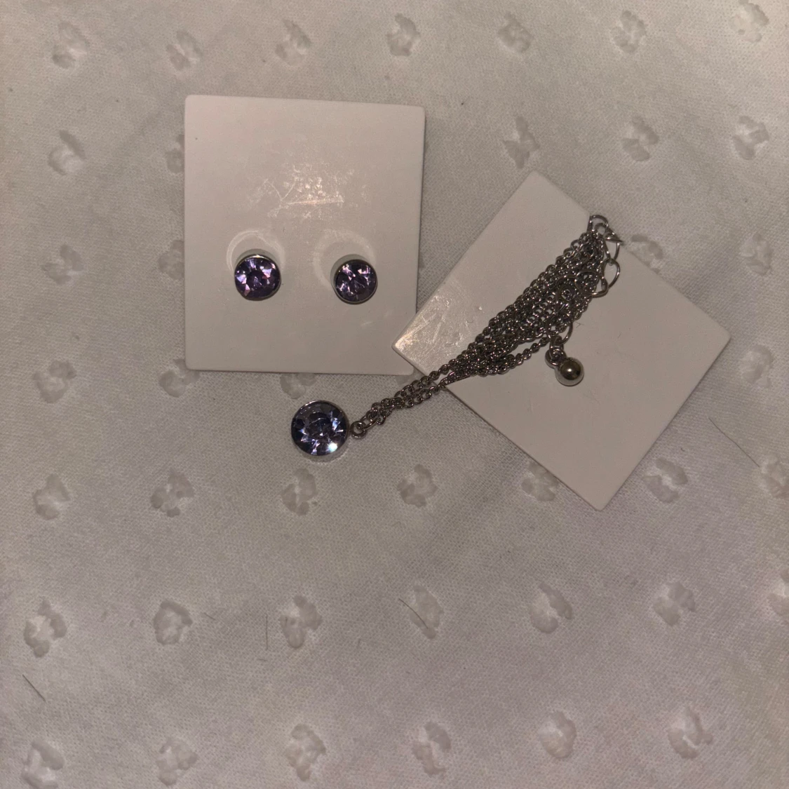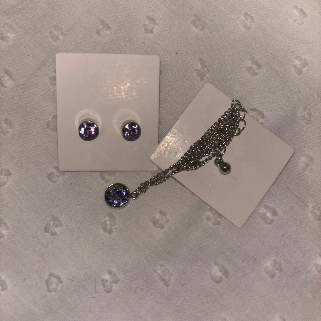 Säljer ett set med silvriga örhängen och matchande halsband, båda med lila glittrande stenar. Perfekt för att ge en färgklick till din outfit. Kedjan är tunn och smidig med ett runt hänge.