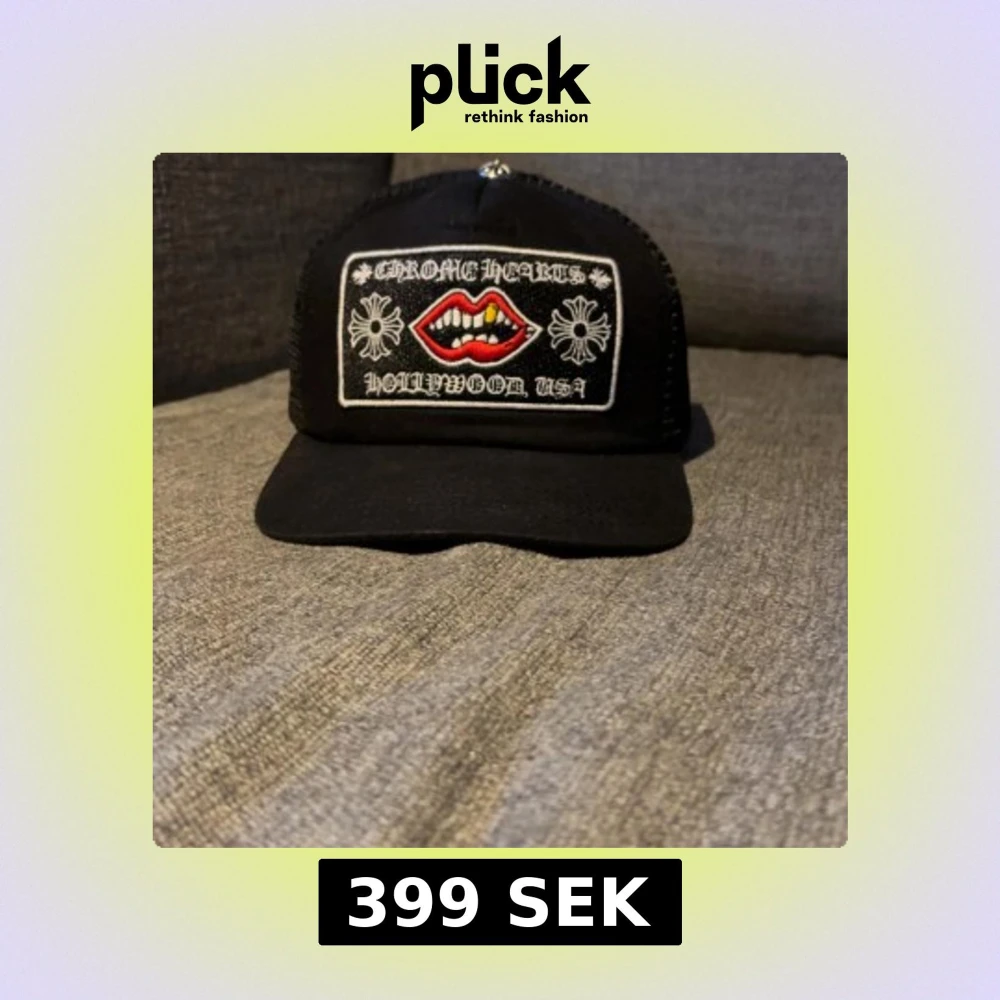 Säljer en svart keps från Chrome Hearts med mesh på sidorna och bak, samt justerbar snapback. Framtill finns en stor broderad patch med text, vita kors och röda läppar. Metallknapp med logga på toppen. Riktigt street och unik stil.