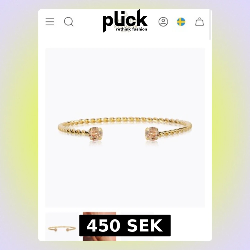 Säljer ett elegant guldarmband från Caroline Svedbom med tvinnad design och två ljusa kristaller i ändarna. Armbandet är öppet och flexibelt, perfekt för att ge en lyxig touch till din outfit.