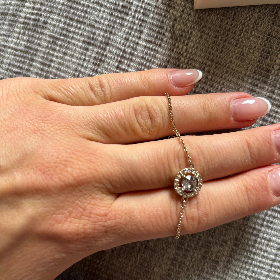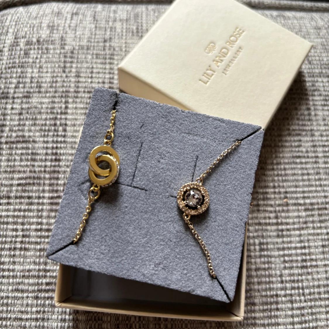 Två eleganta armband i guldton från Lily and Rose & Snö. Det ena har en rund gnistrande sten omgiven av små stenar, det andra har en stilren dubbel cirkeldetalj. Perfekta för att lyfta din look med lite extra glans.