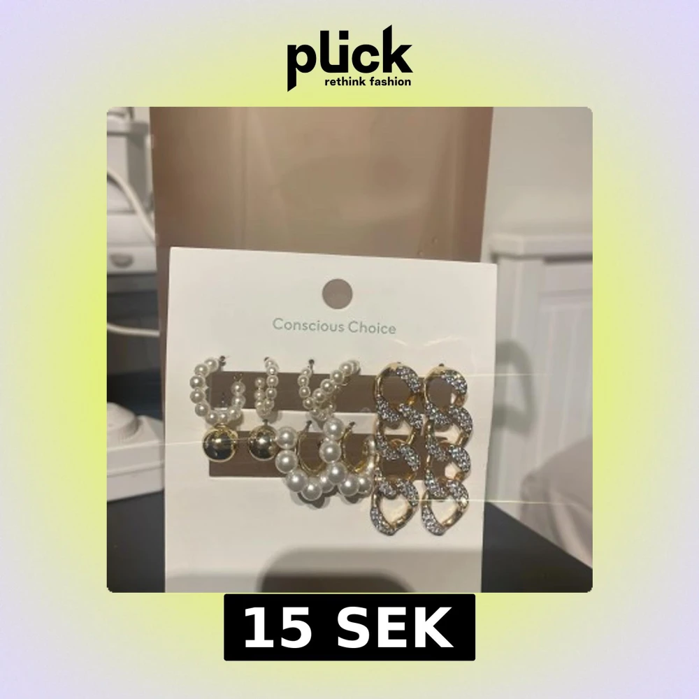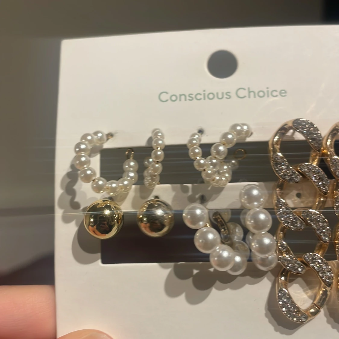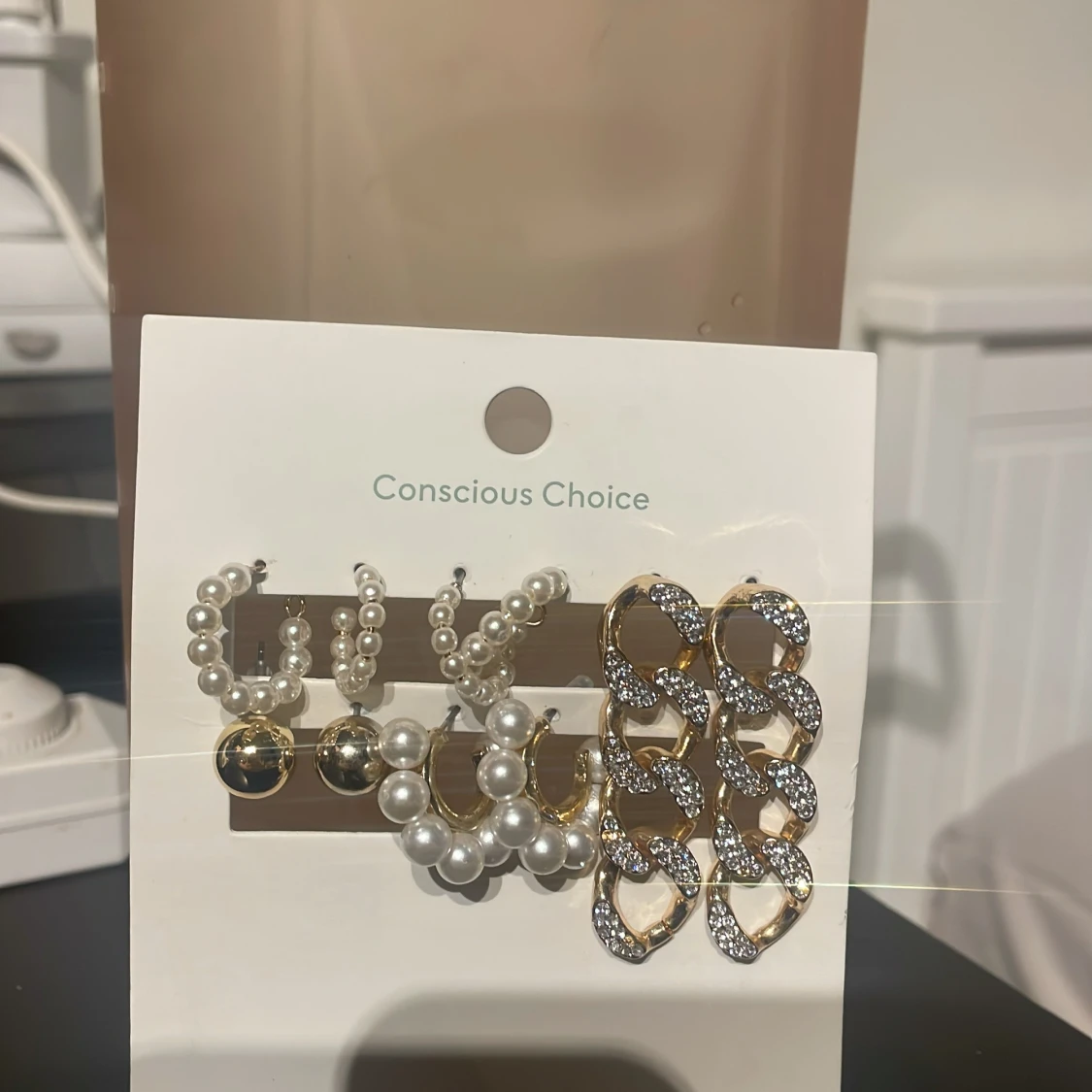 Flera par örhängen i ett set: guldiga studs, pärlformade hoops och chunky guldiga örhängen med glittrande stenar. Mix av klassiska pärlor och trendiga kedjelänkar med strass.
