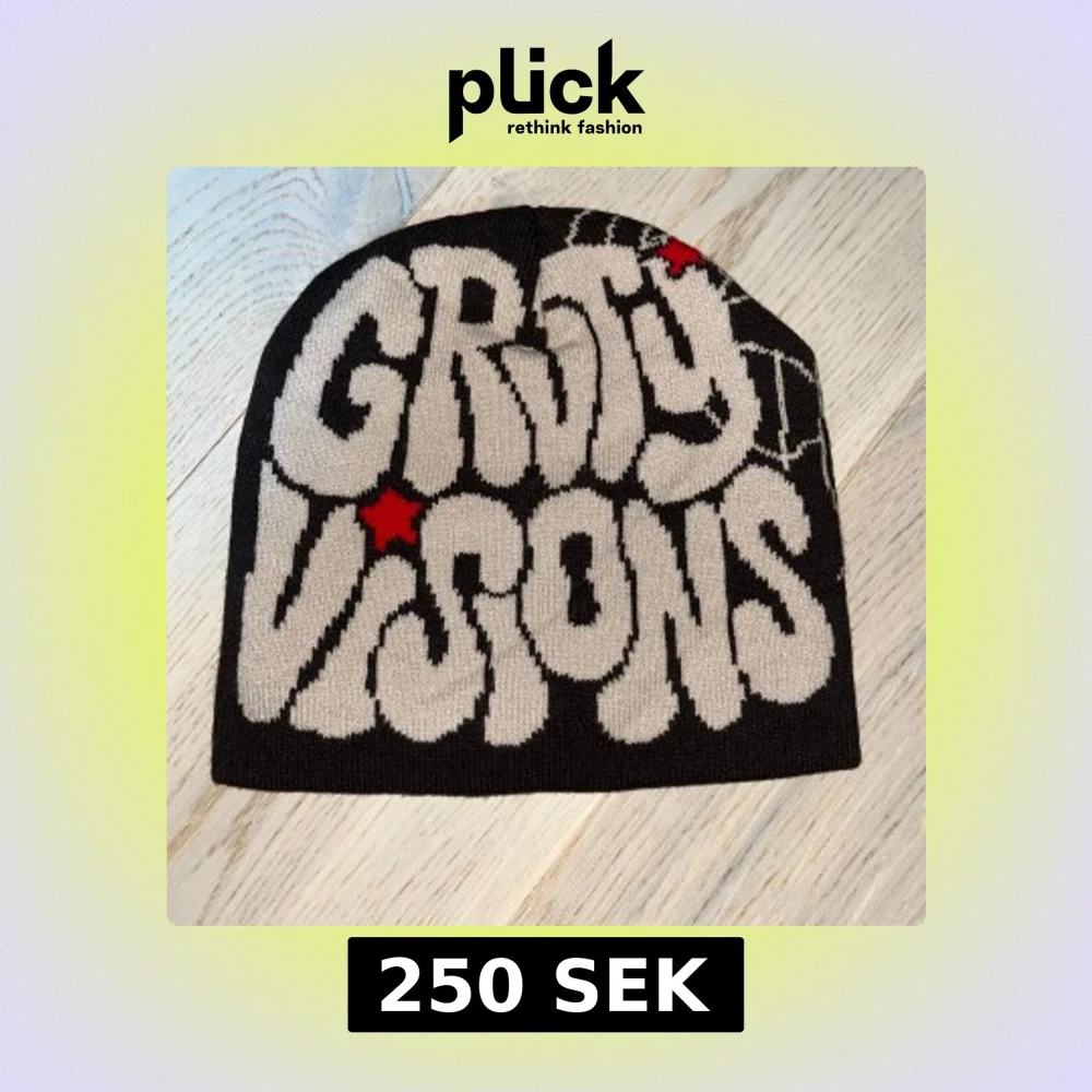 Cool svart mössa med stor vit text 'GRITTY VISIONS' och röda stjärnor på framsidan. Baksidan har ett stort vitt spindelnätsmönster. Stickad i mjukt material, perfekt för dig som vill sticka ut med din stil.