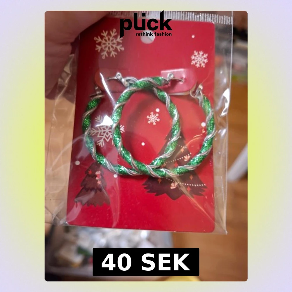 Säljer två par stora creoler med glittrigt spiral-mönster. Ena paret är grönt och silver, andra paret är rött, grönt och silver. Perfekta för att maxa julstämningen! Örhängena är metallfärgade med färgglada glitterdetaljer som verkligen poppar.