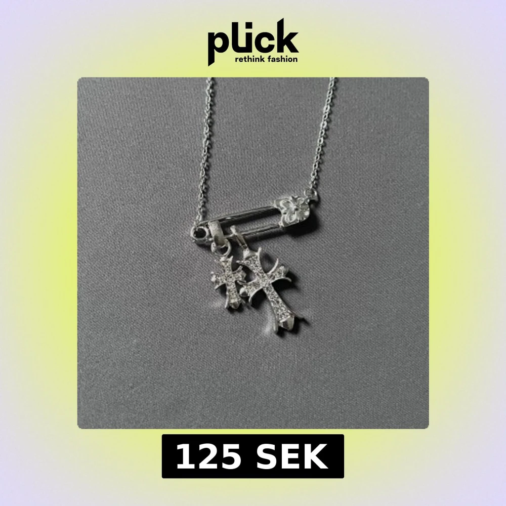 Silverfärgat halsband med två kors & säkerhetsnål berlock. Cirka 50 cm.