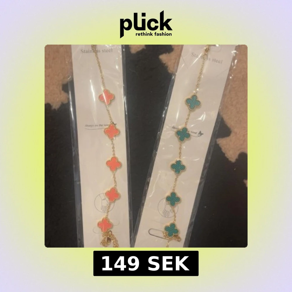 Två stilrena armband i guldtonad metall med fyrklöverformade hängen. Det ena armbandet har korallrosa hängen och det andra har turkosblå hängen med diskreta ränder. Båda har fina pärldetaljer runt varje klöver. Perfekt accessoar för att lyfta din look.