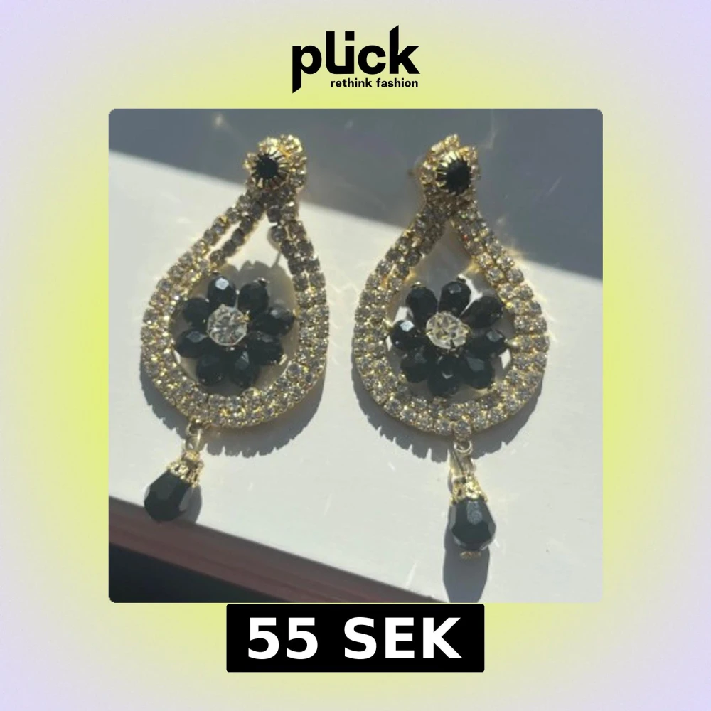 Säljer ett par droppformade örhängen med glittriga stenar och svarta blomdetaljer i mitten. Örhängena har guldfärgade kanter och en svart pärla som hänger längst ner. Perfekta för dig som gillar statement-smycken med mycket bling och cool design.