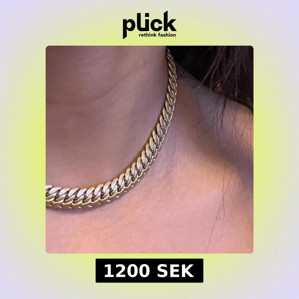 Säljer ett chunky halsband och matchande armband i guldtonad metall med breda, platta länkar. Kedjan har en klassisk och stilren design som ger en cool vibe. Perfekt för dig som gillar statement-smycken och vill sticka ut med din look.
