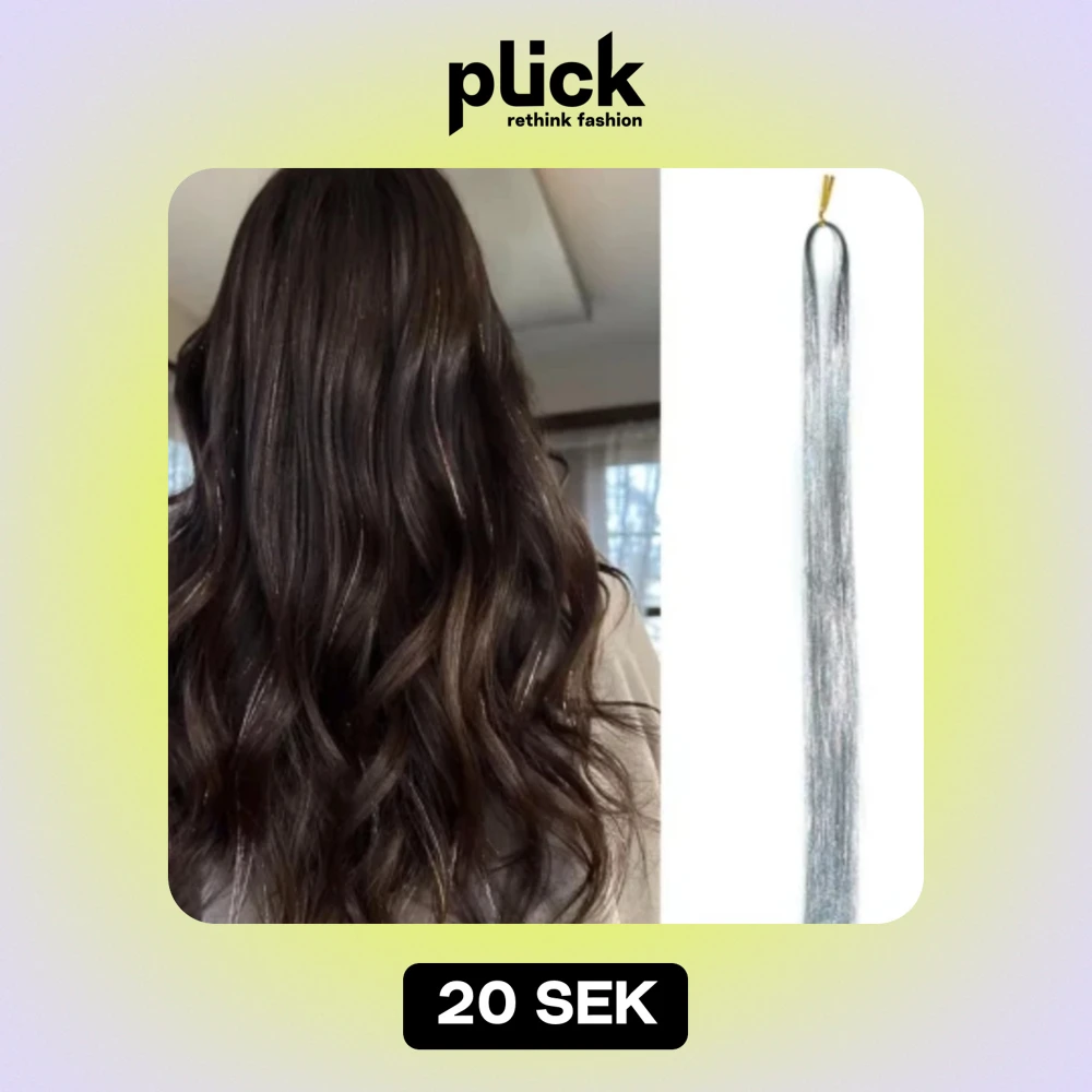 Snygga glittriga hårstrån som du enkelt kan fästa i håret för en extra touch till din look. Perfekt för fester eller speciella tillfällen när du vill sticka ut lite extra. De är långa och silvriga, vilket ger en cool effekt i håret. Lätta att använda och ta bort.