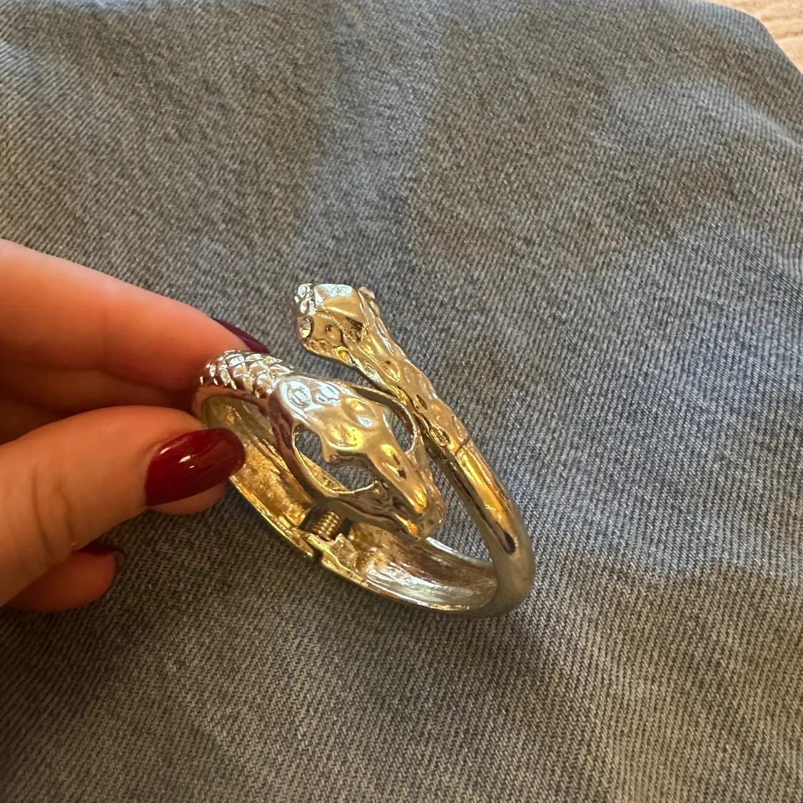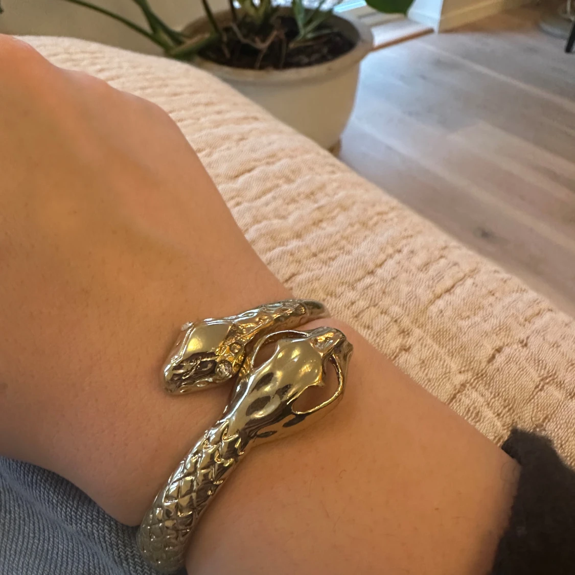 Unikt guldigt armband med två detaljerade ormar som möts framtill. Armbandet har en snygg, skulpterad yta med markerade fjäll. Perfekt statement piece för dig som gillar djurmotiv och coola accessoarer.