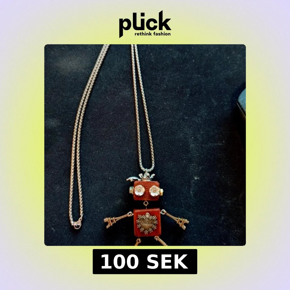 Unikt halsband med en robotberlock i brunt och guld. Robotens kropp är dekorerad med blommor och ett hjärta med texten 'AMOUR'. Armar och ben har små Eiffel-torn och kugghjul som detaljer. Kedjan är i guldton och berlocken har en cool, lekfull design.