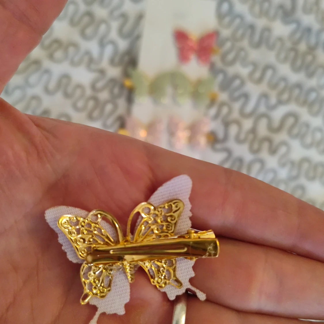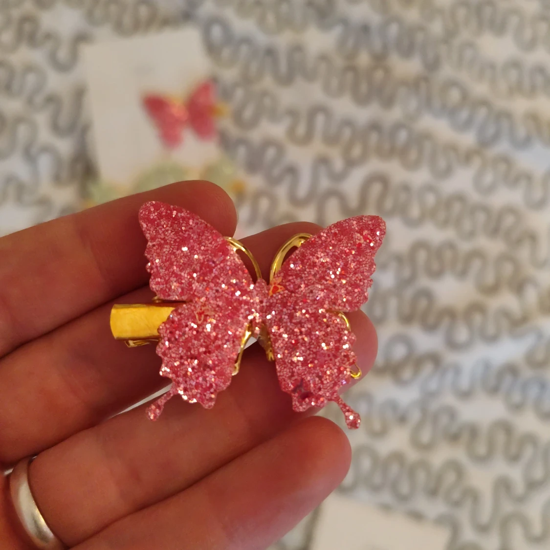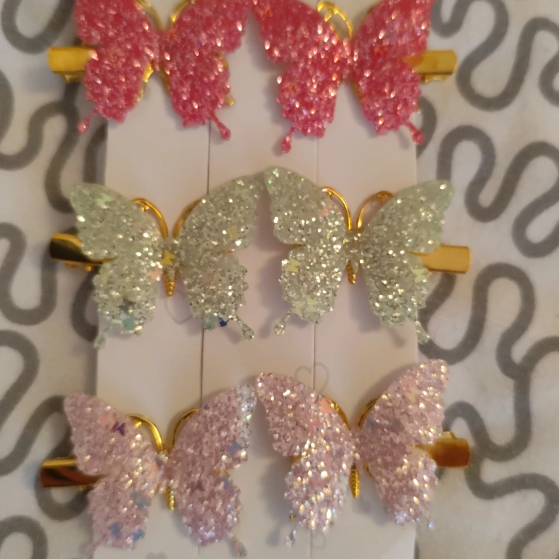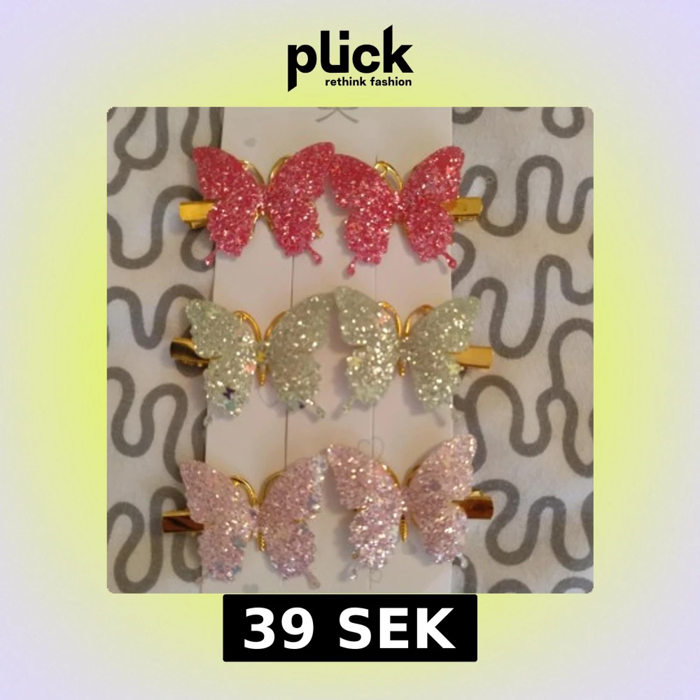 Säljer ett set med sex diadem i form av fjärilar, täckta med glitter i rosa, ljusgrön och ljusrosa. Fjärilarna har guldfärgade detaljer och sitter på hårklämmor. Perfekt för att ge din frisyr extra bling och färg. Superfina till alla som gillar glitter och söta accessoarer.