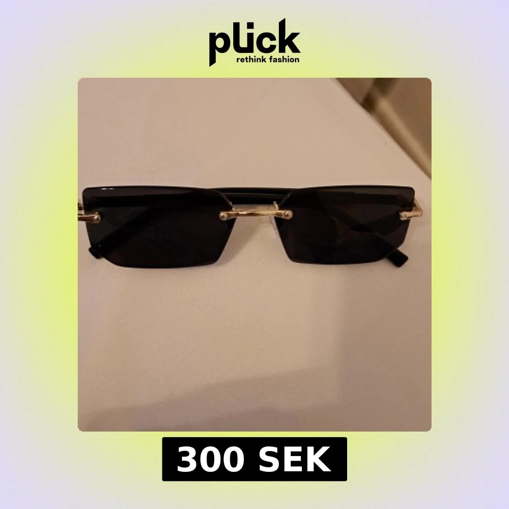 Trendiga solglasögon med svarta, rektangulära glas och tunna guldfärgade detaljer. Glasögonen har minimalistisk design utan synlig båge runt glasen och smala svarta skalmar med gulddetaljer. Perfekt accessoar för en stilren look.
