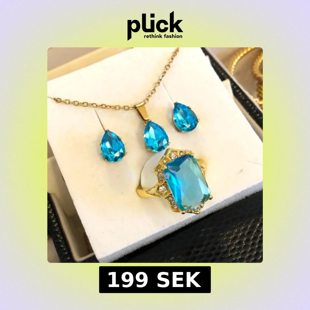 Snyggt smyckeset i guld färg metall med ett halsband och örhängen Både halsbandet och örhängena har dropp formade blå turkos färgade stenar. Ringen är samma färg och stor cocktail modell med små vita kristaller runt mitten stenen. De är i jätte fint skick och bara använt på en fest förra året. Jag vet inte storlek på ring men gissar ca 17-17,5 jag har den på mitt mitten finger på vänster hand.