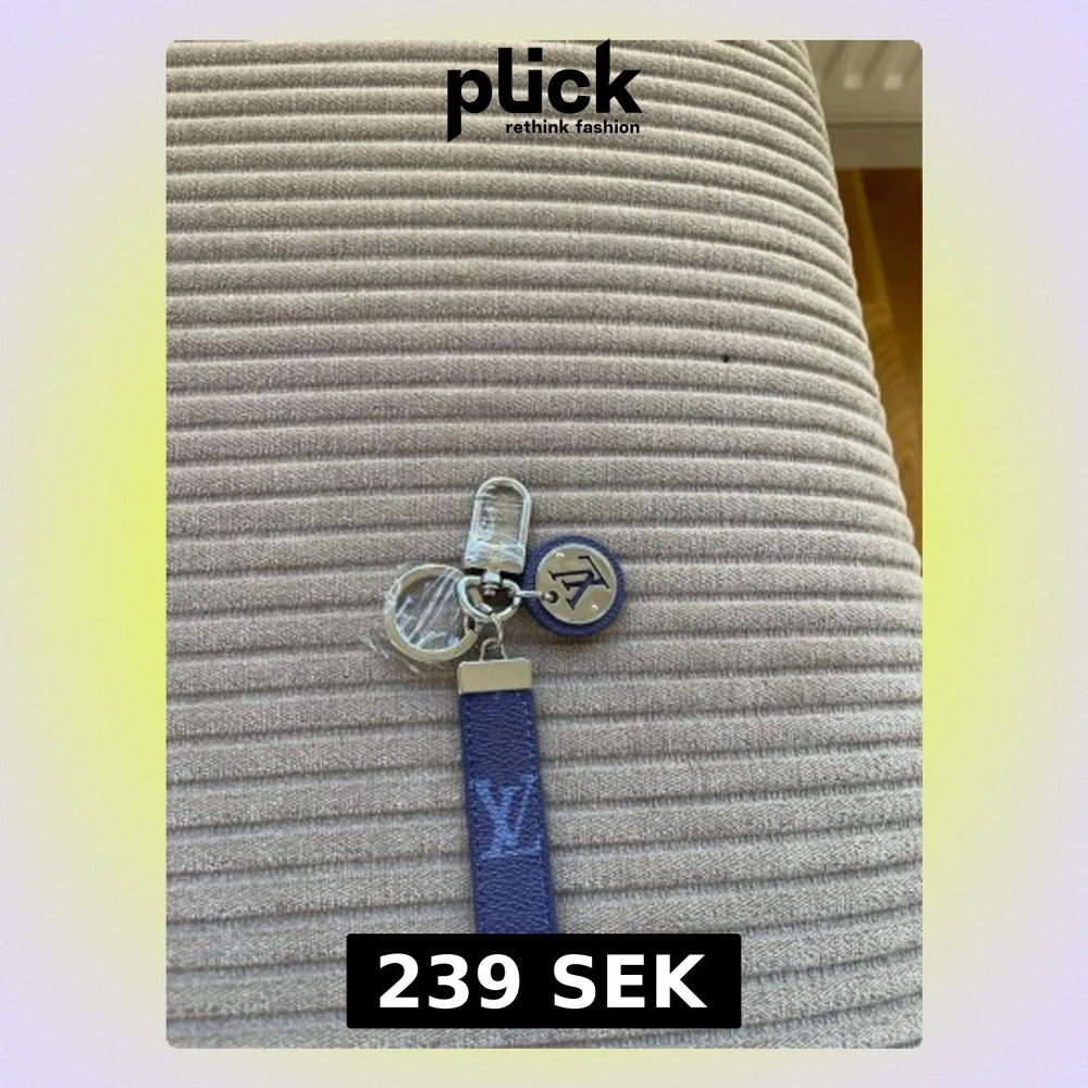 Snygg nyckelring från Vuitton i blått läder med silverfärgade metalldetaljer. Har -logga på både läderremmen och den runda brickan. Perfekt som accessoar till väskan eller nycklarna.