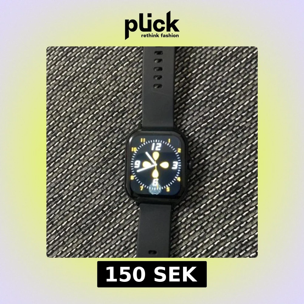 Snygg svart smartklocka med fyrkantig display och svart silikonarmband. Klockan har touchskärm, flera appar och sportlägen som fotboll och basket. Perfekt för dig som gillar teknik och vill ha koll på mobilen direkt på handleden.
