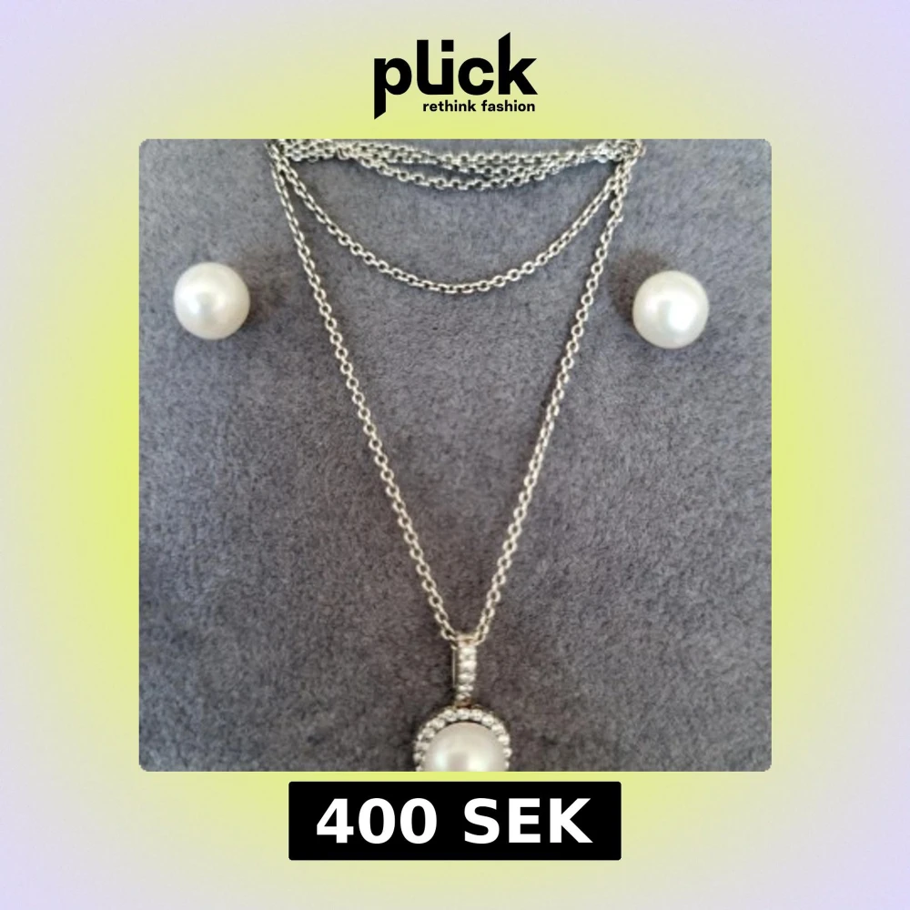 Set med ett elegant silverhalsband och matchande örhängen från Sterling. Halsbandet har ett hänge med en vit pärla omgiven av små gnistrande stenar. Örhängena är klassiska pärlknoppar i vitt. Perfekt för dig som gillar stilrena smycken med lyxig känsla.