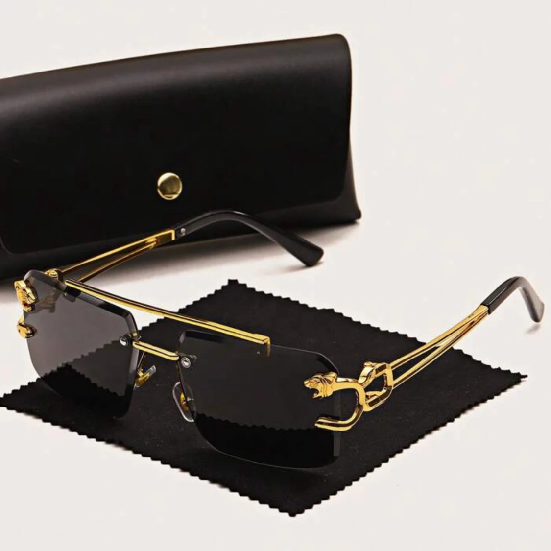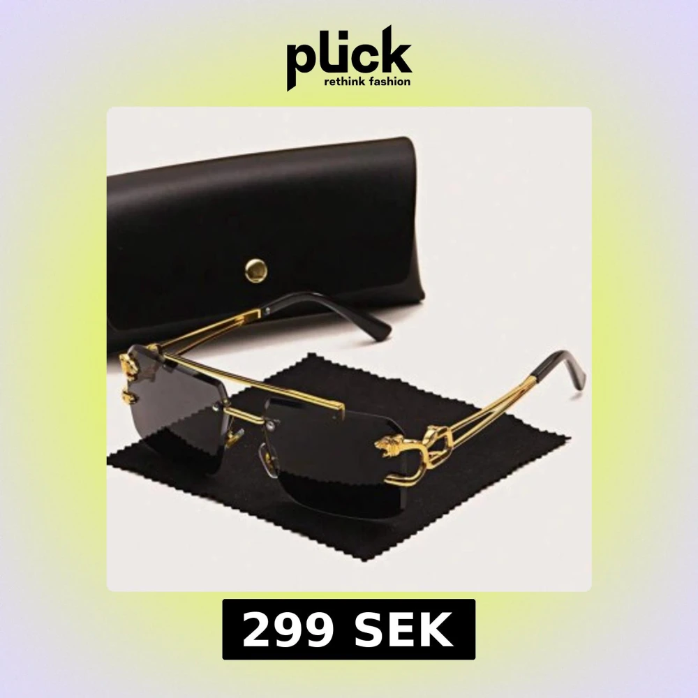 Stilrena solglasögon med svarta, rektangulära glas och tunna guldfärgade bågar. Snygga detaljer med lejonhuvuden på sidorna och svarta skalmar. Perfekta för dig som vill sticka ut med en lyxig och modern look. PRISET KAN DISKUTERAS!