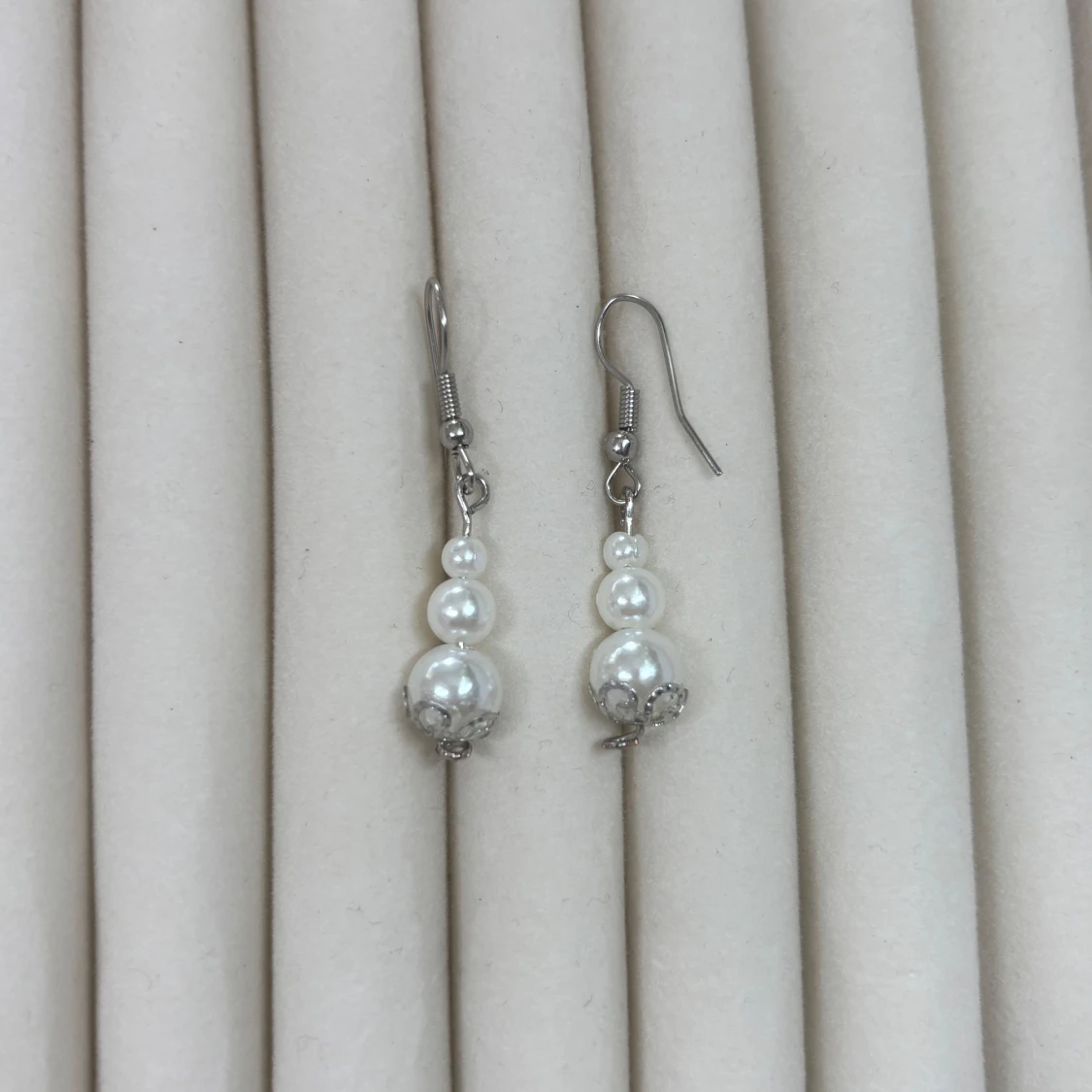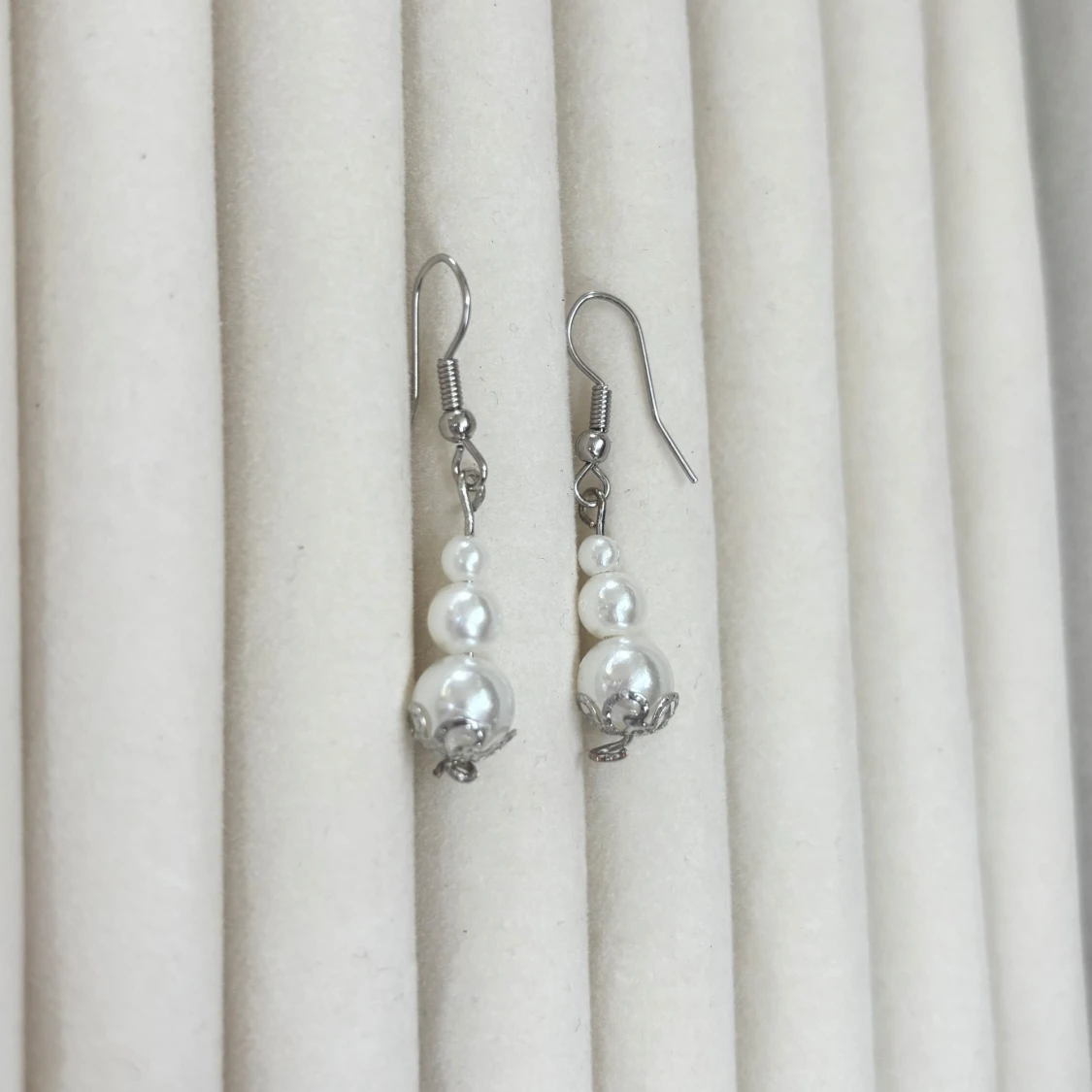 Säljer ett par eleganta örhängen i silverfärg med tre vita pärlor i olika storlekar på varje örhänge. Perfekta för att ge en klassisk touch till din stil. Krokar i metall och dekorativa detaljer vid den största pärlan.