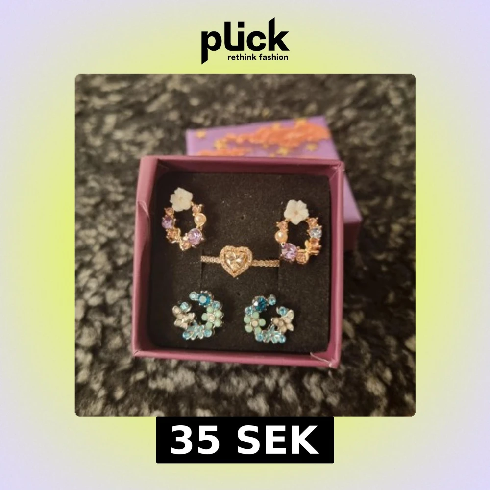 Supergulligt smyckeset med två par örhängen och en ring. Ringen är roséguldfärgad med ett rosa hjärta av glittrande stenar. Material : koppar