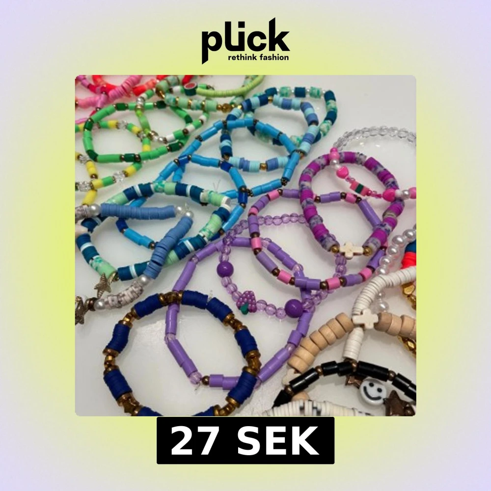 Säljer 30 st handgjorda armband i alla möjliga färger som blå, lila, rosa, grön, gul, röd, svart och vit. Armbanden är gjorda av töjbar plasttråd och olika pärlor och berlocker i massor av färger!!