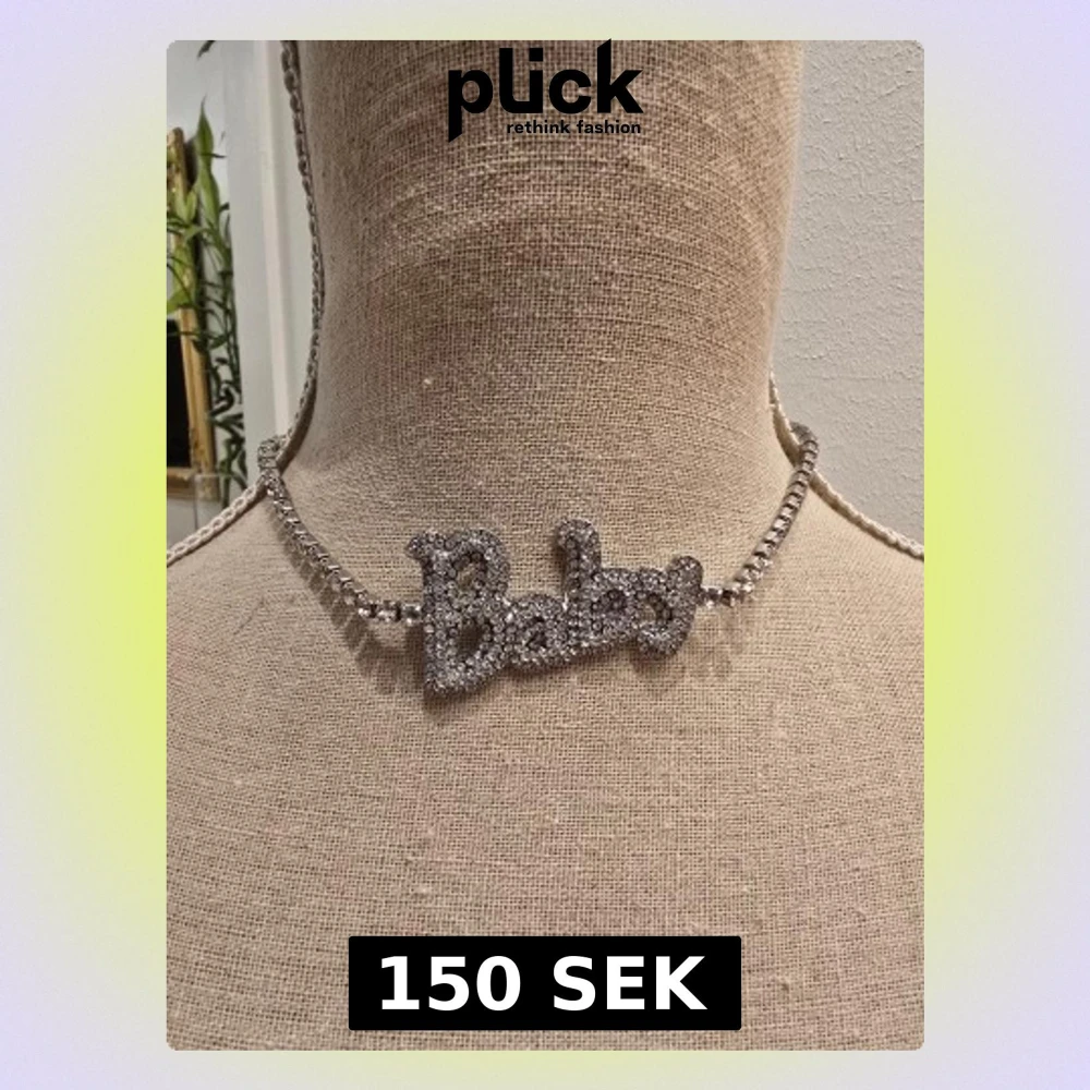 Bilden visar ett halsband med texten 'Baby' i glittriga stenar, men ingen väst finns med.