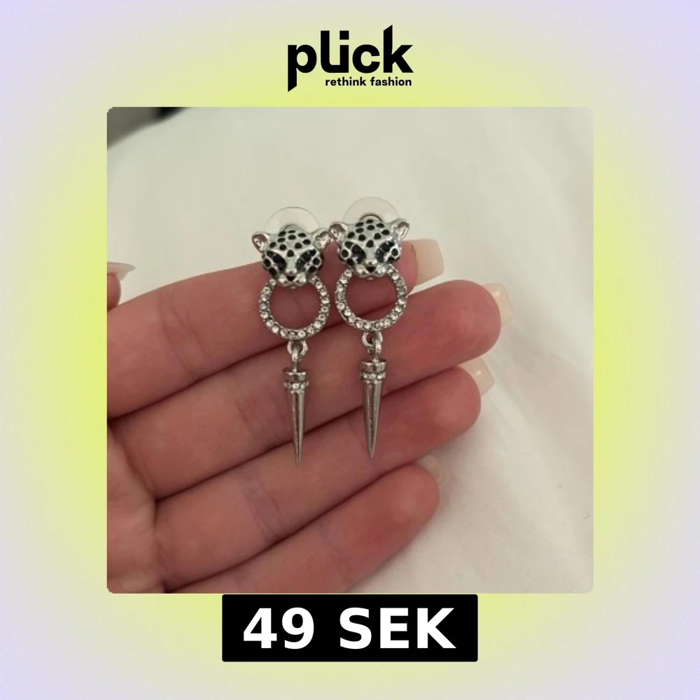Coola örhängen i silverfärg med leopardhuvud i svart och vitt, glittrande strassringar och spetsiga hängen. Perfekt statement-accessoar för dig som vill sticka ut med djurmönster och edgy detaljer.