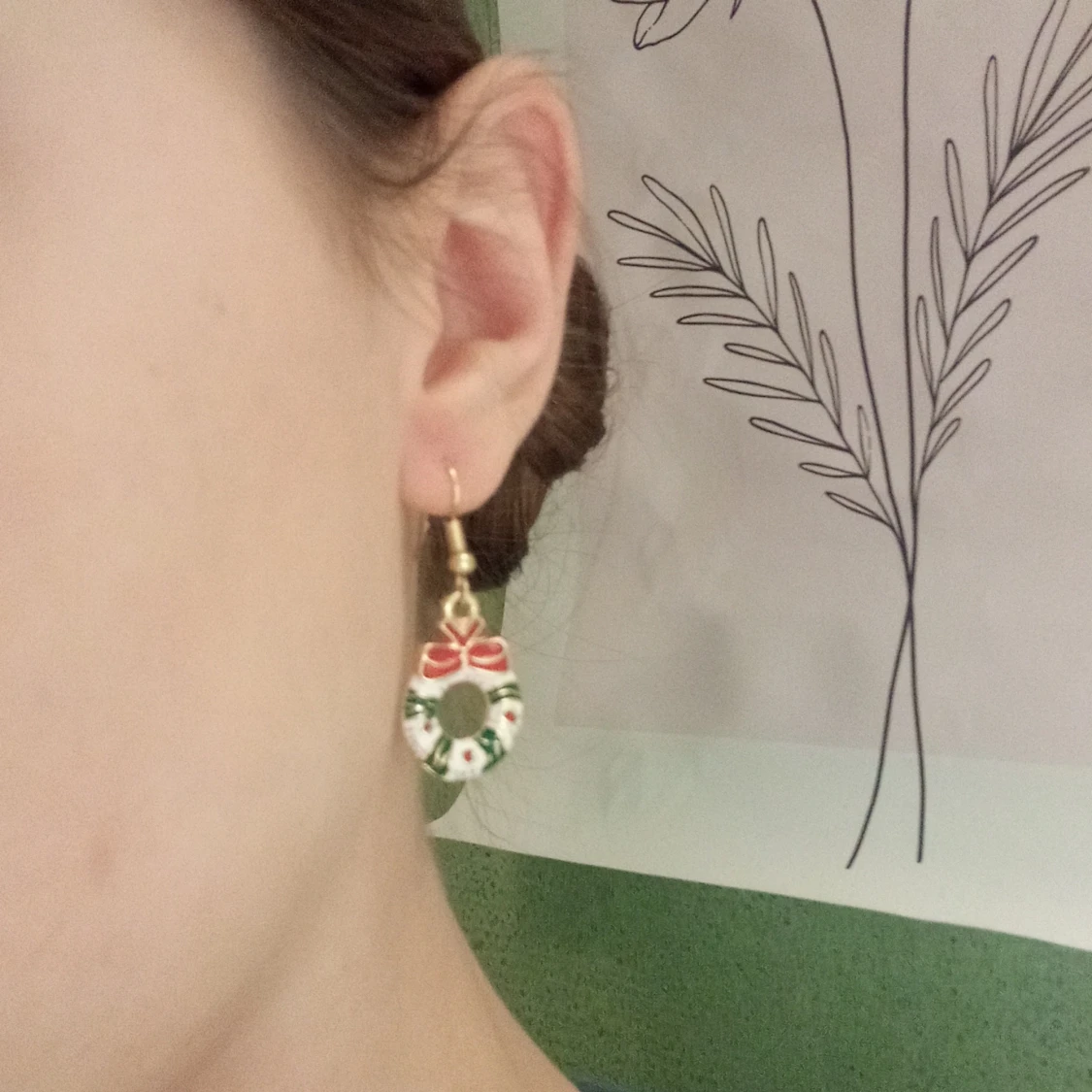 Charmiga örhängen i form av julkransar med röda rosetter och gröna detaljer. Perfekta för att sprida julstämning! De har en enkel krok för att enkelt sätta i och ta ur.