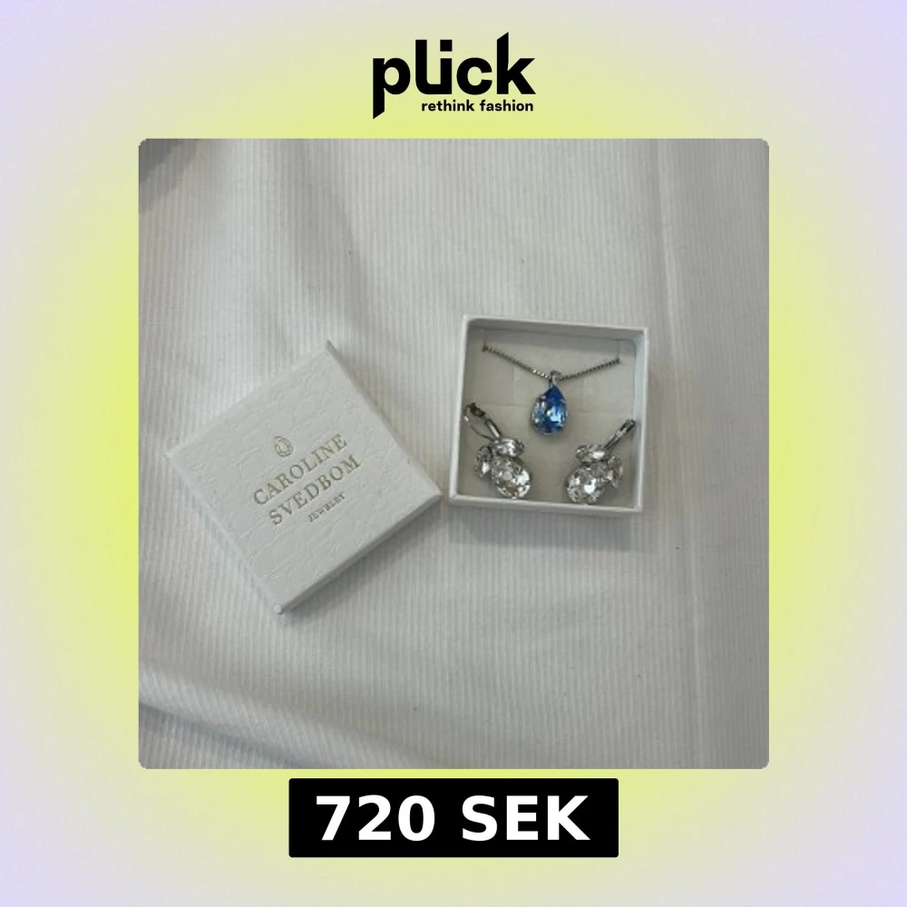 Snyggt smyckeset från Caroline Svedbom med ett halsband med blå droppformad kristall och matchande örhängen med stora, glittriga klara stenar. Nypris ca. 1400kr💗☀️Opps örhängena är slitna å lite svåra att stänga.